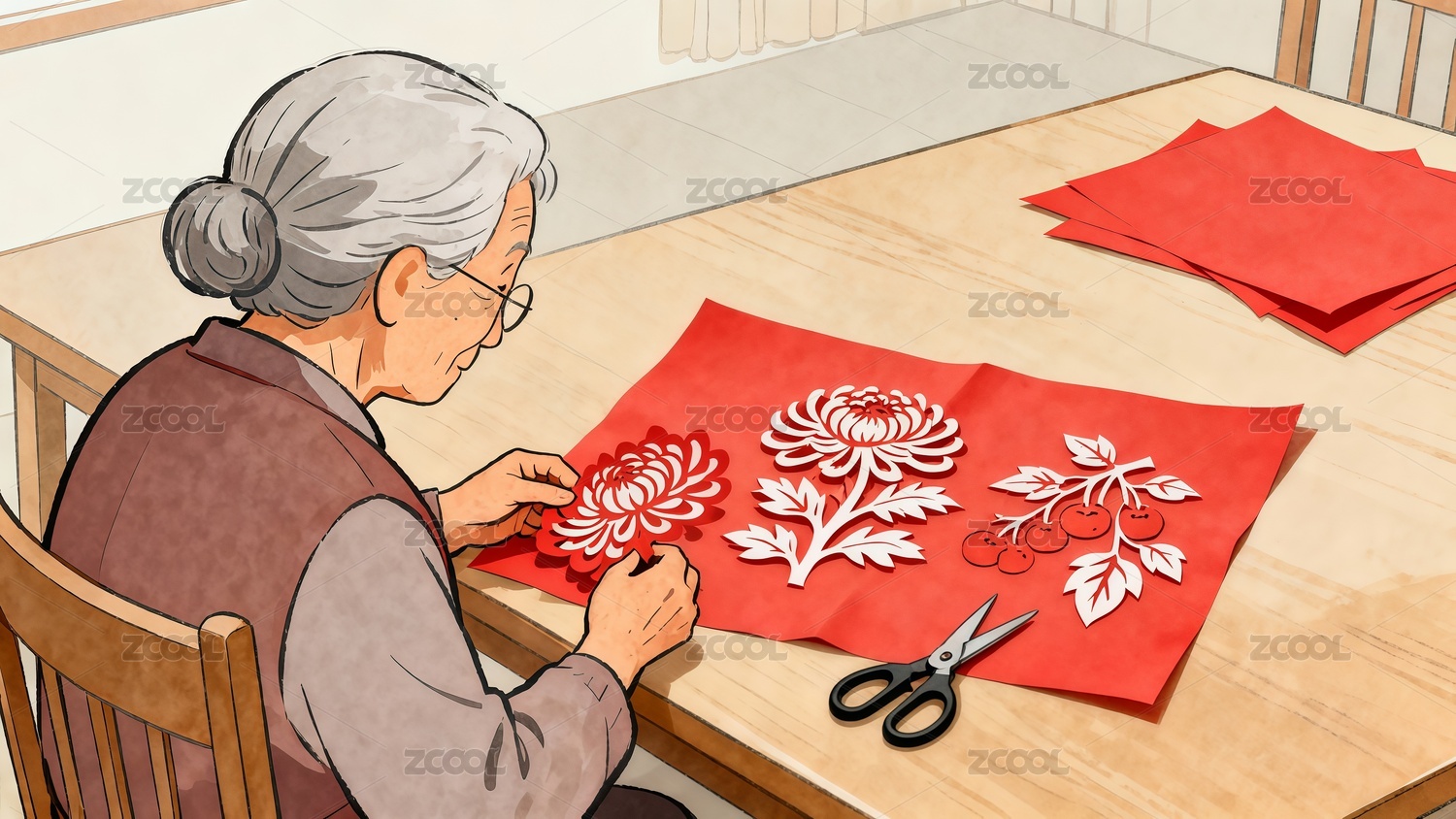 手绘风格老年人做重阳节主题剪纸