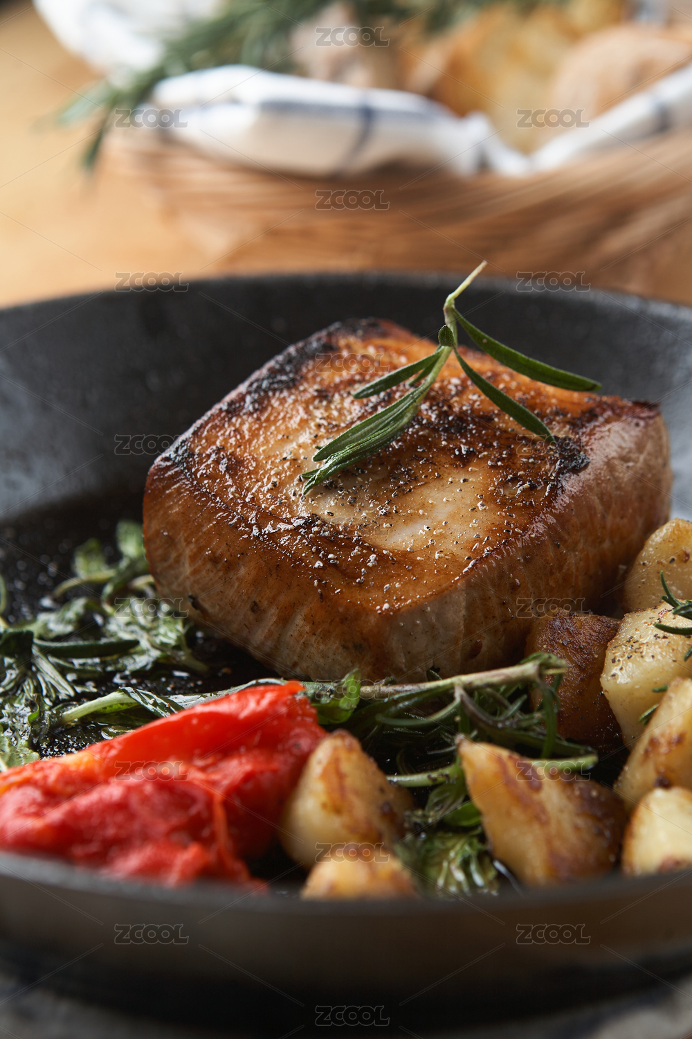 装在平底铸铁锅里的一块迷迭香煎香猪肉佐甜