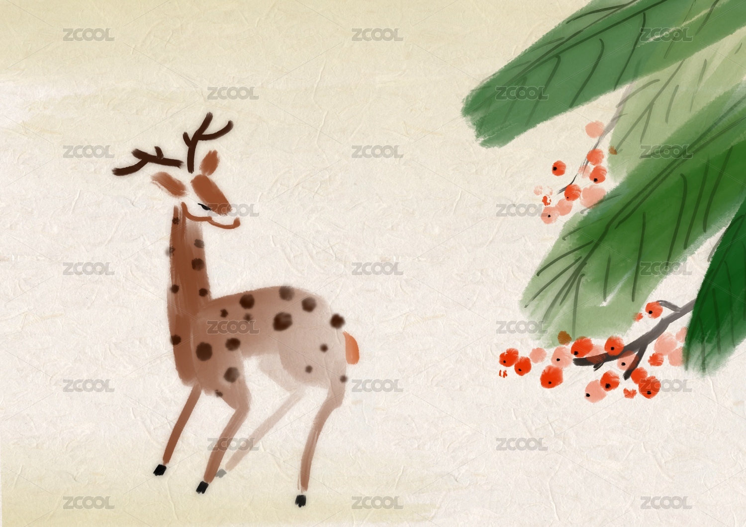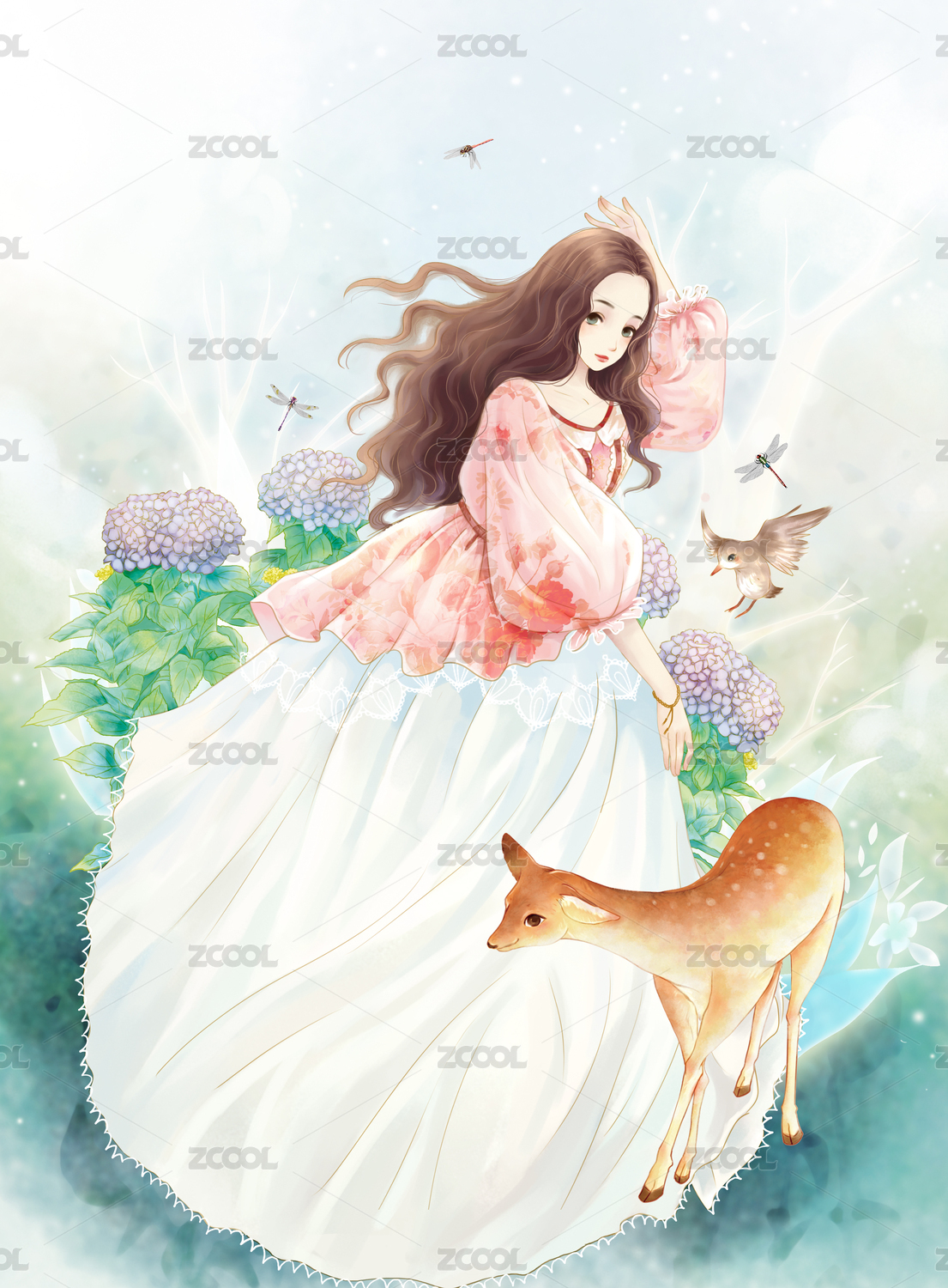 梅花鹿和穿粉色上衣白色纱裙的少女