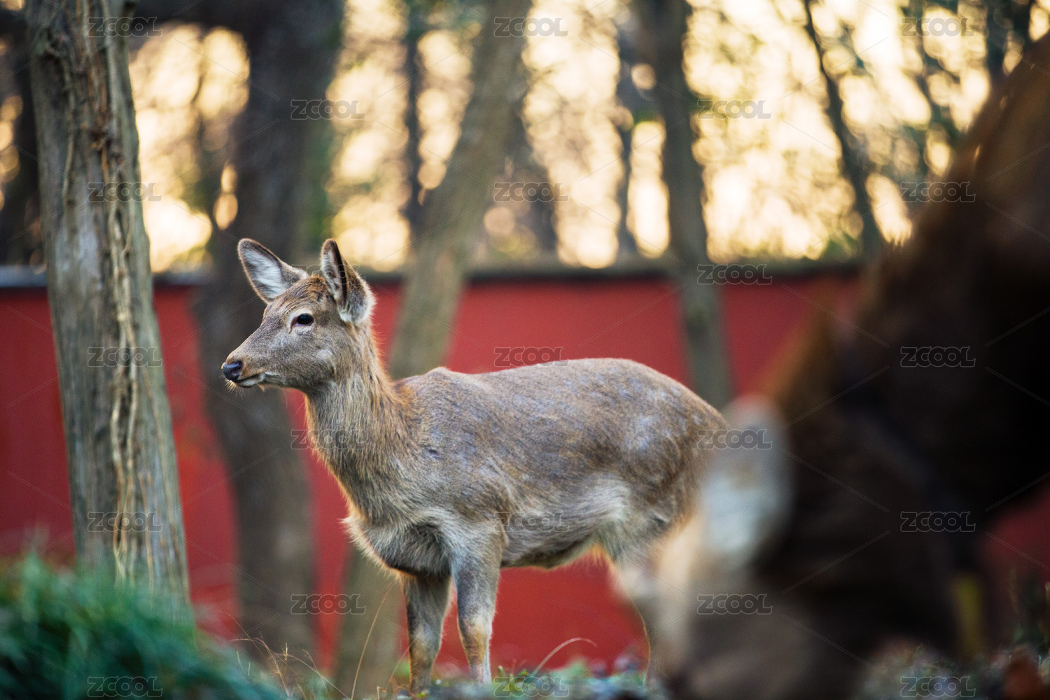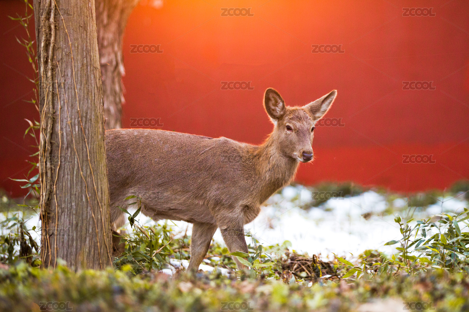冬日中国江苏南京明孝陵景区梅花鹿和红墙