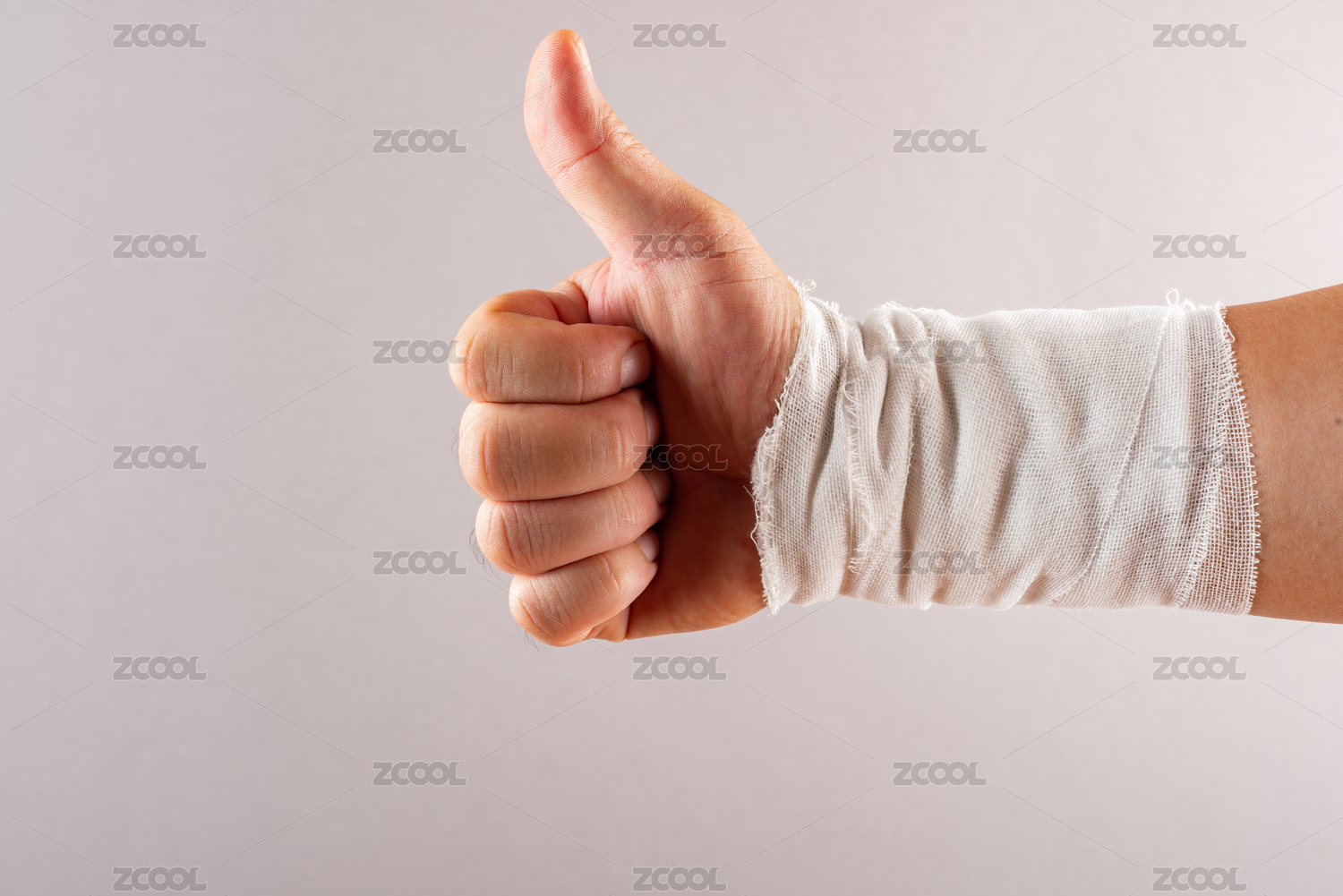 男人受伤包扎的手竖起大拇指