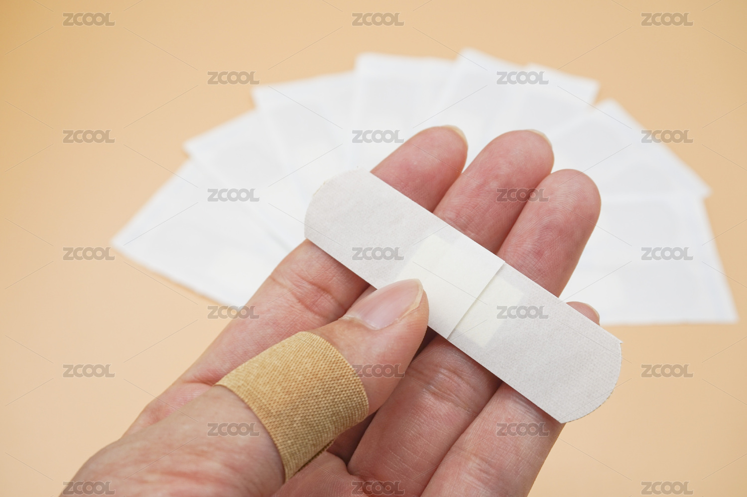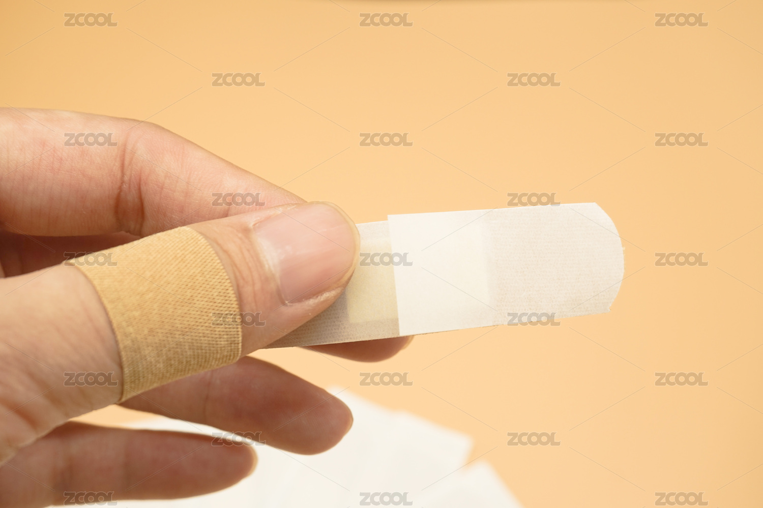 橘红色背景中受伤的手指和创可贴