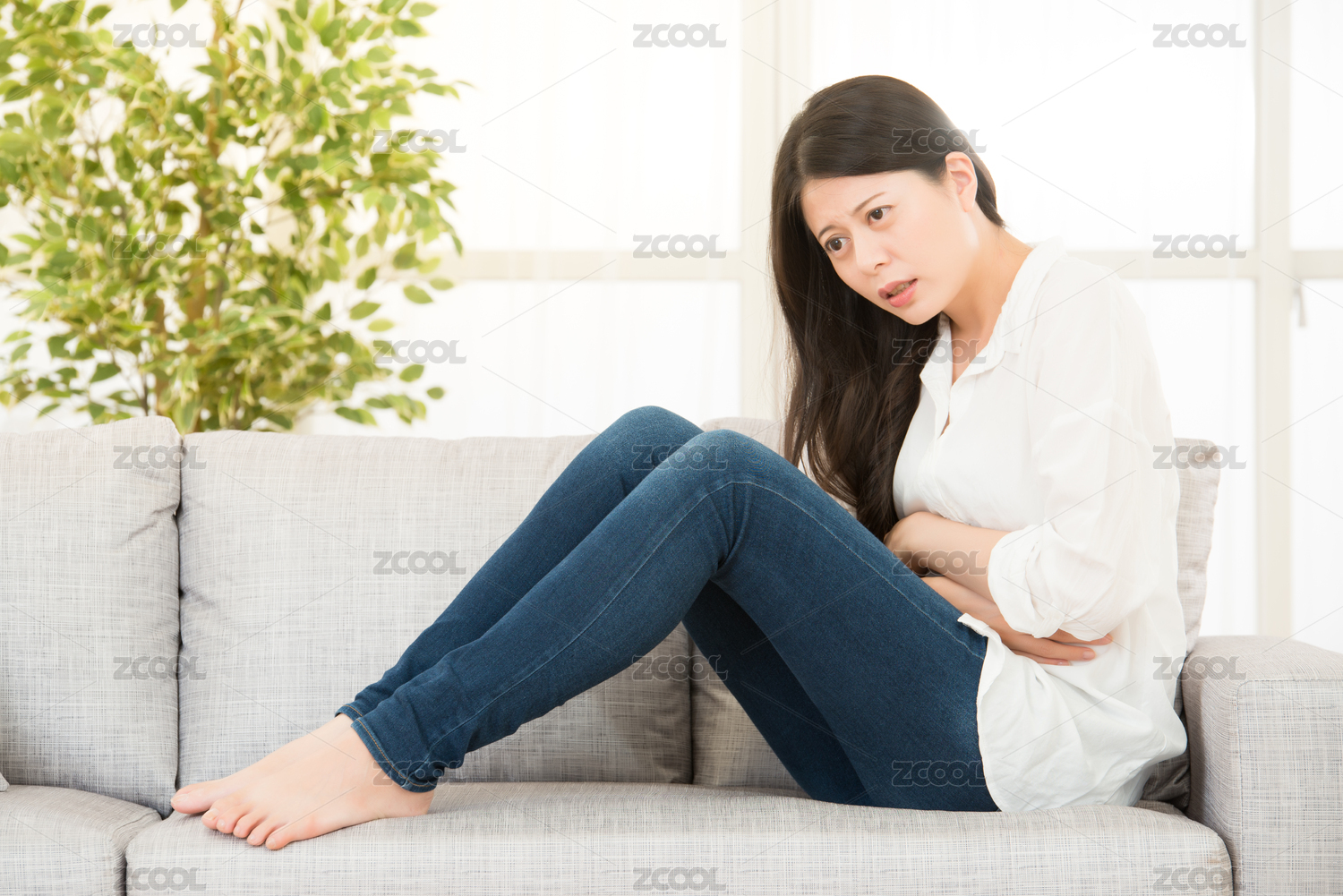 年轻漂亮的女子抱着腹部受伤患胃痉挛和痛经痛苦的表情女性月经概念坐在家里沙发上。生活方式和健康理念。