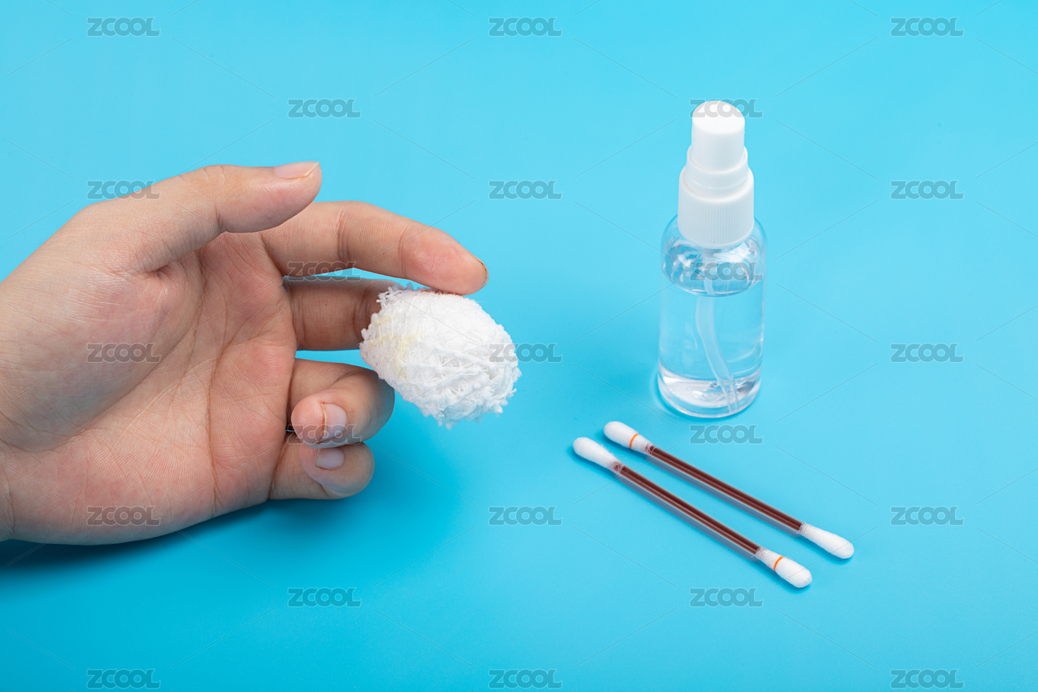 蓝色背景上受伤的手指和酒精