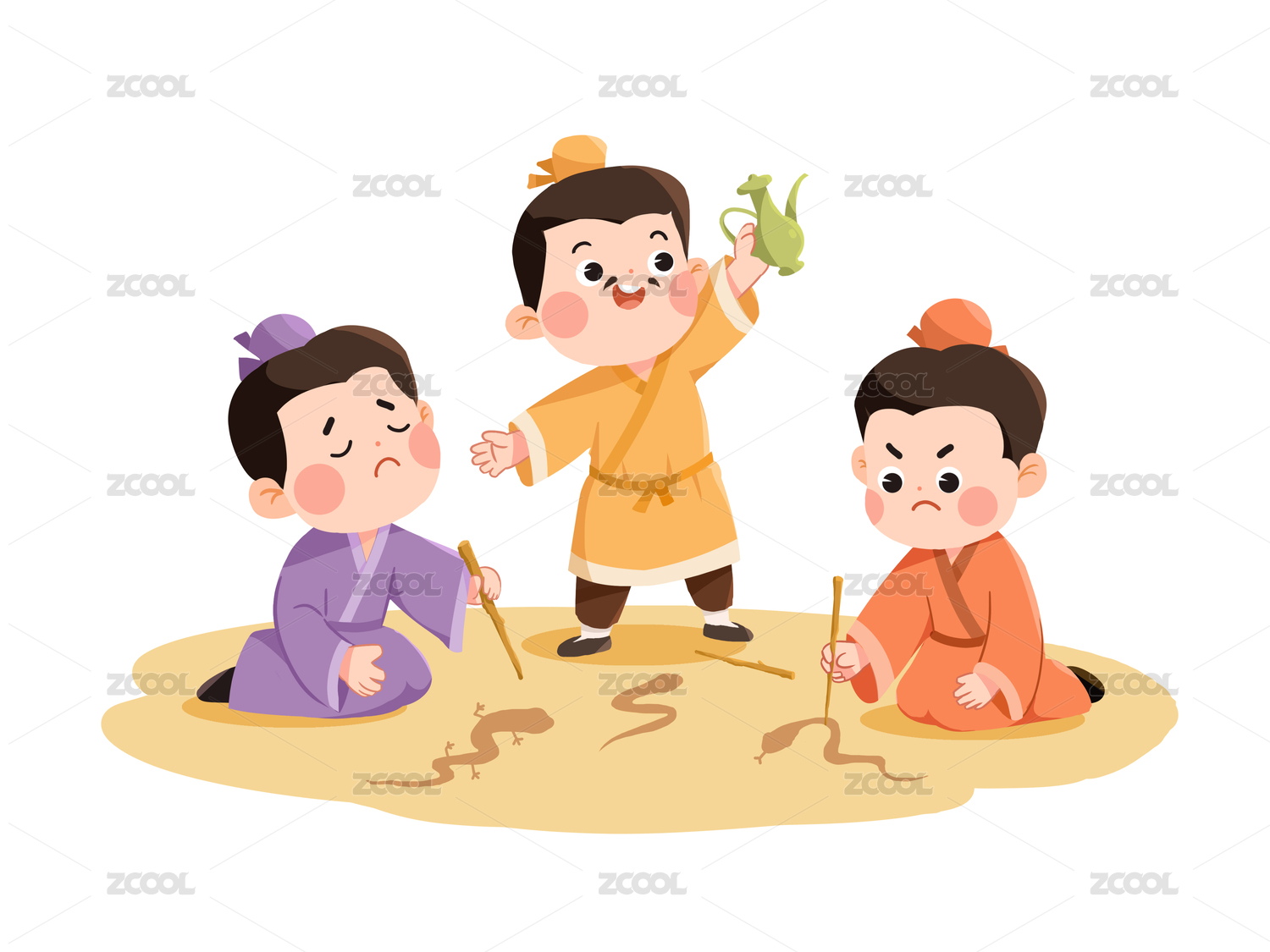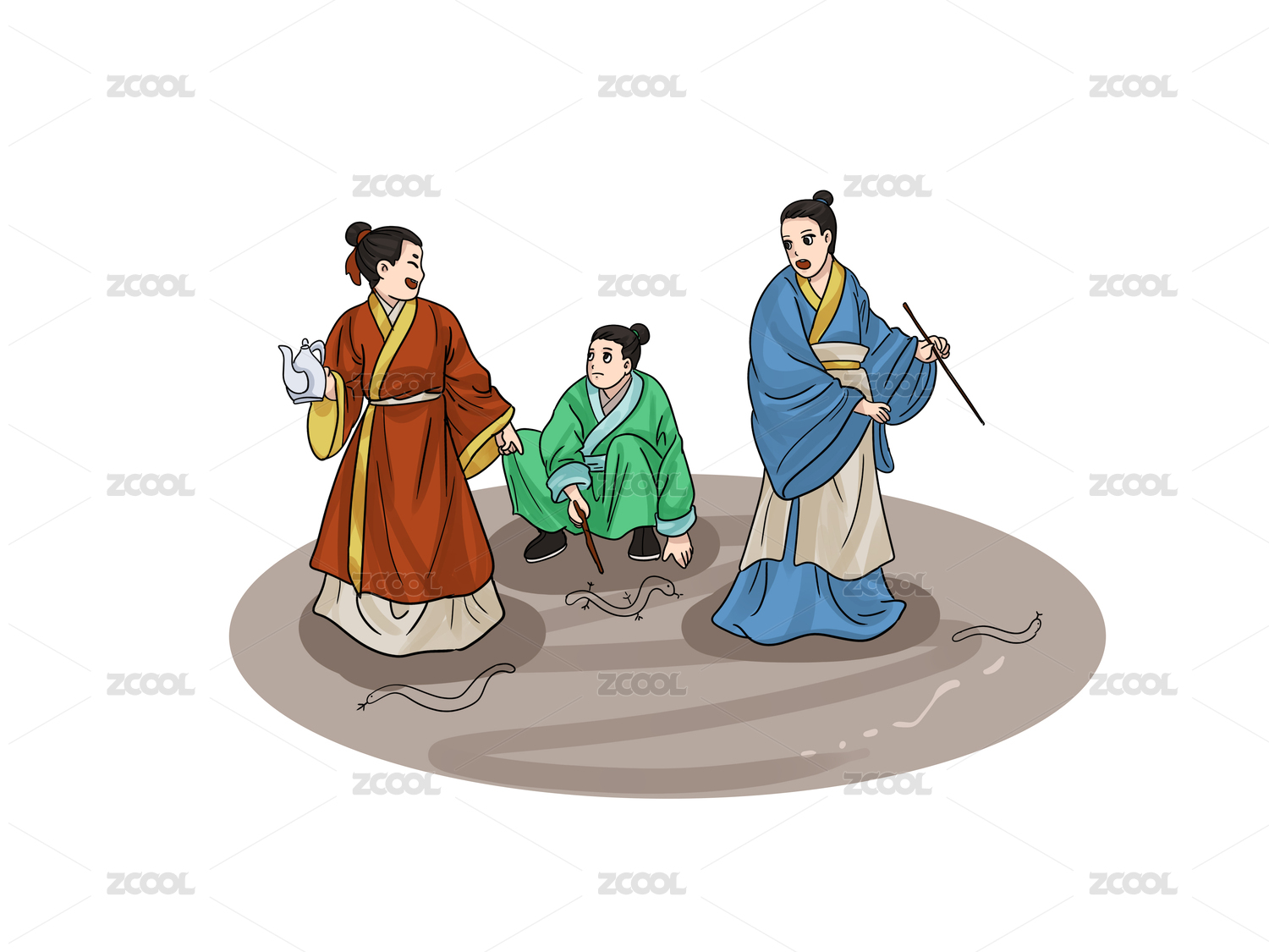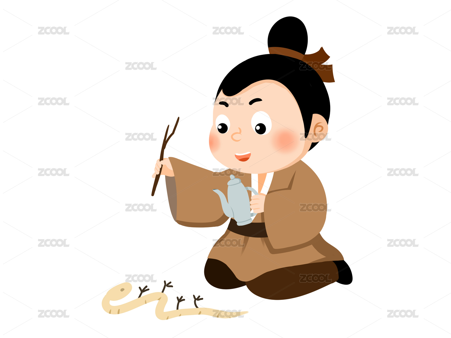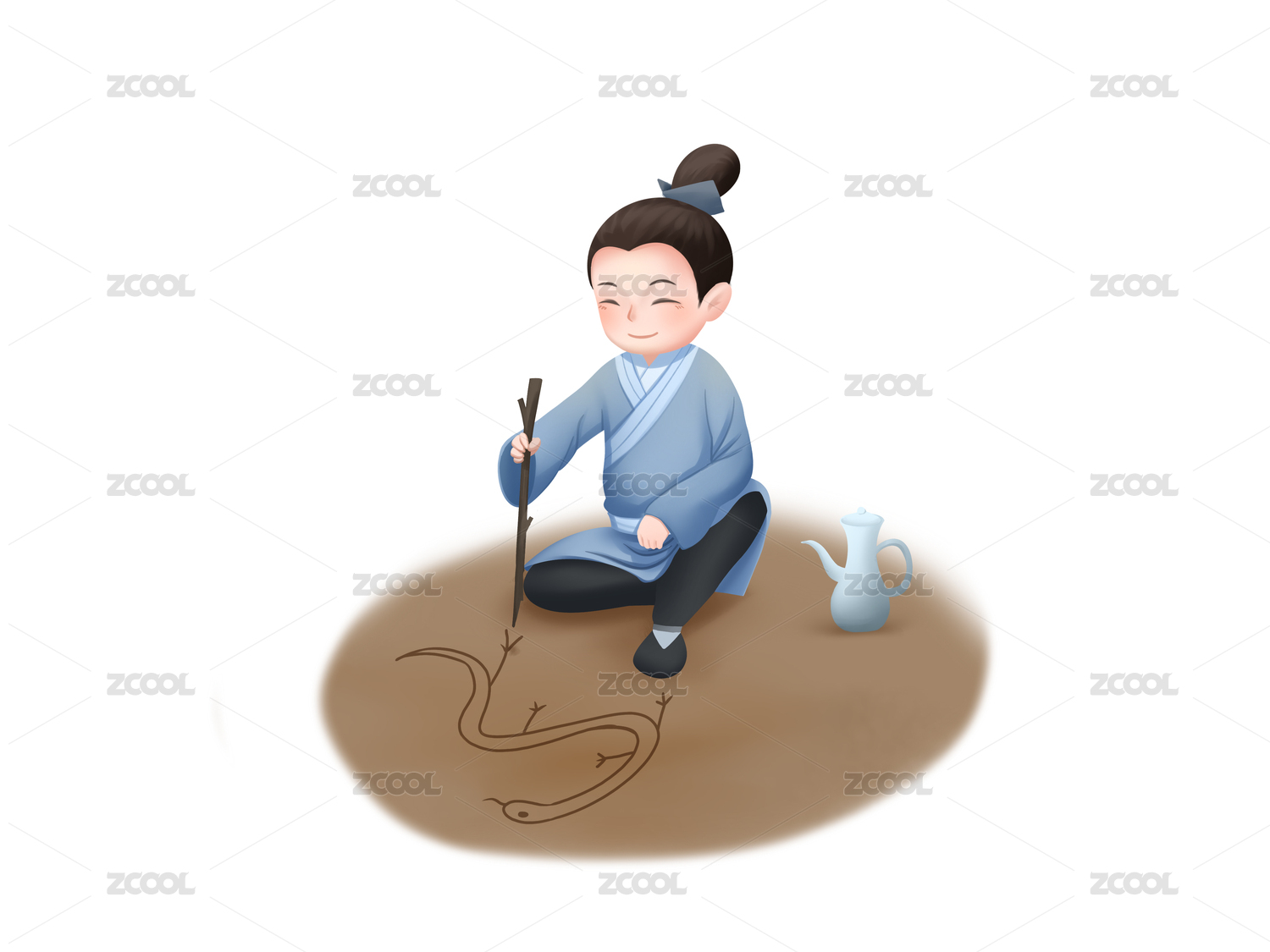 成语画蛇添足古装棕色衣服男孩坐地上画蛇