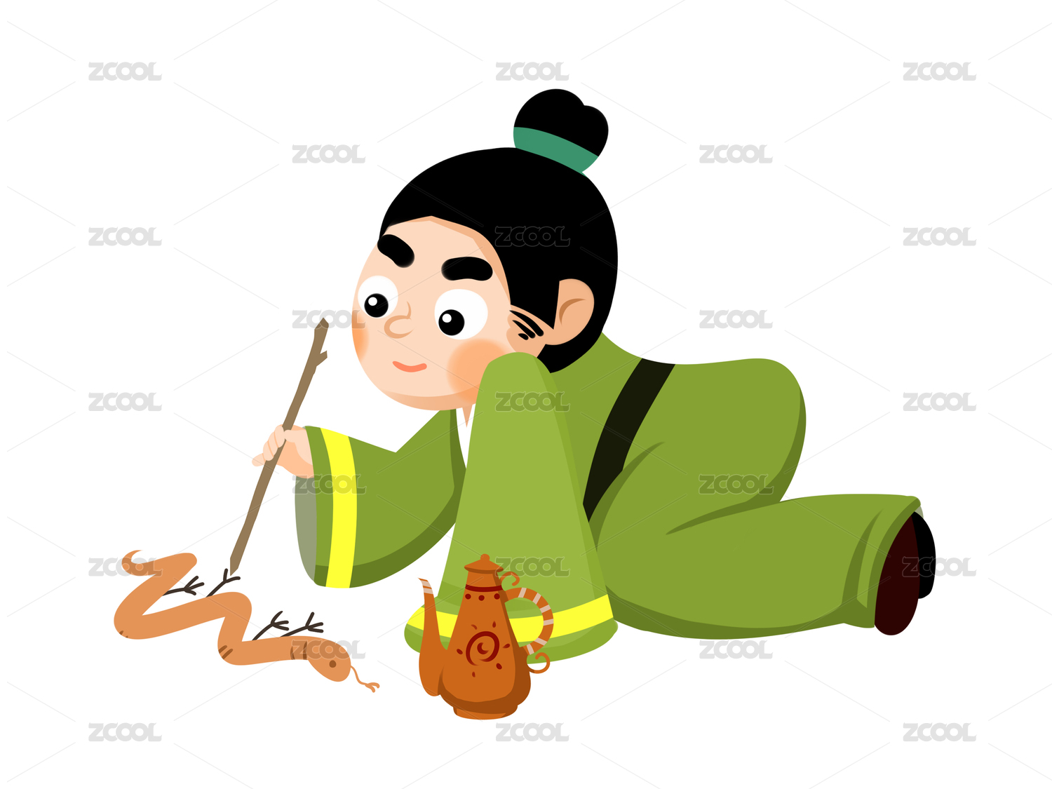 成语画蛇添足古装绿色衣服男孩爬地上画蛇