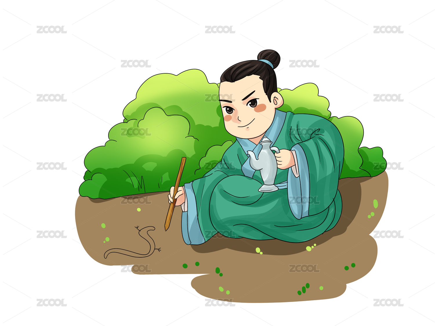 成语画蛇添足单人男子坐地上画蛇旁边有酒壶
