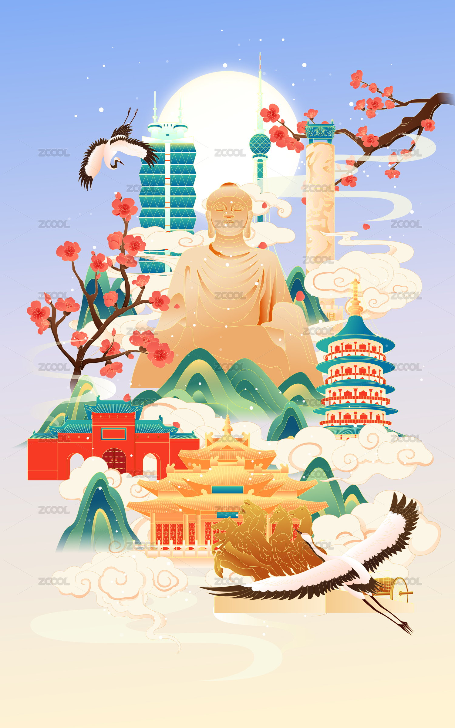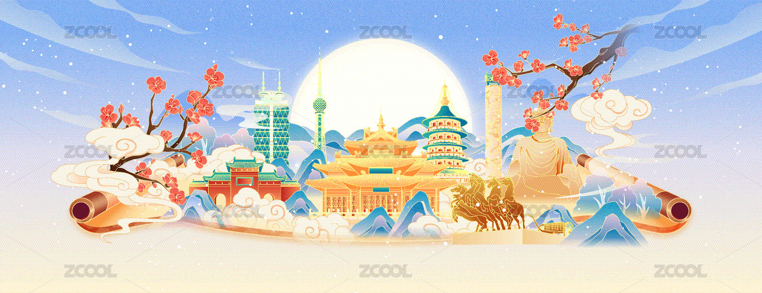 国风冬天中国洛阳城市建筑画卷矢量插画