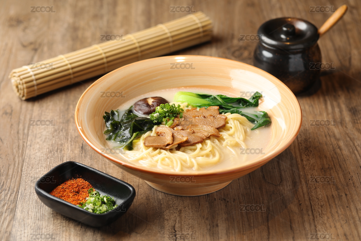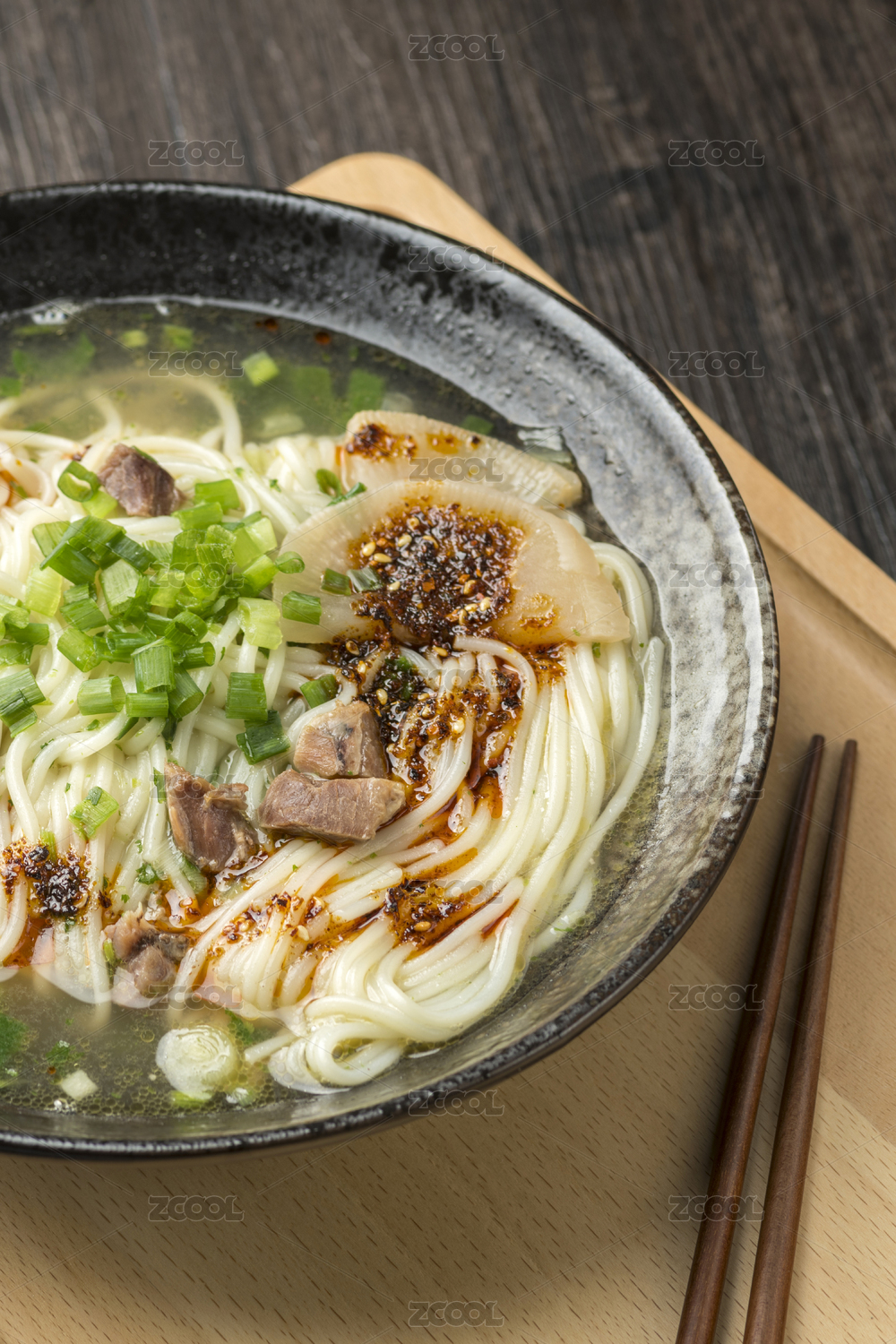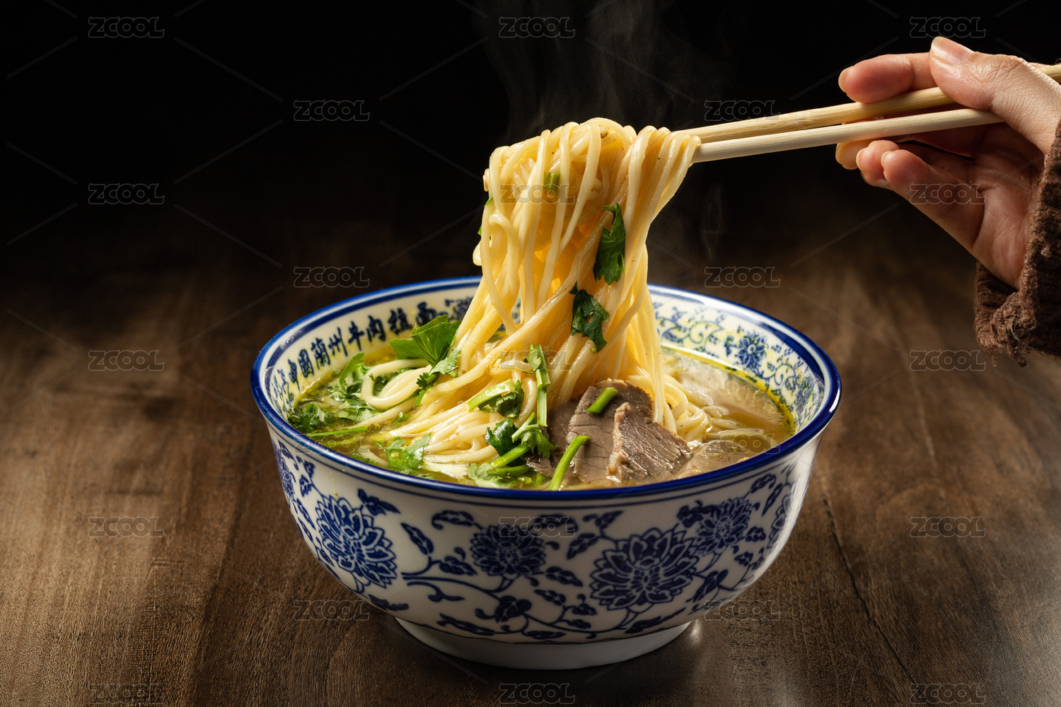 一碗兰州牛肉拉面摆放在木桌面上