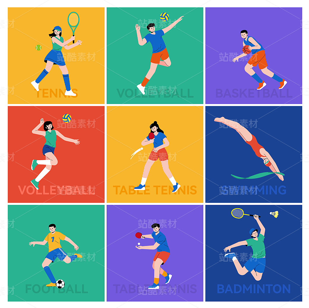 体育人物-运动项目矢量扁平插画-网球羽毛球乒乓球排球