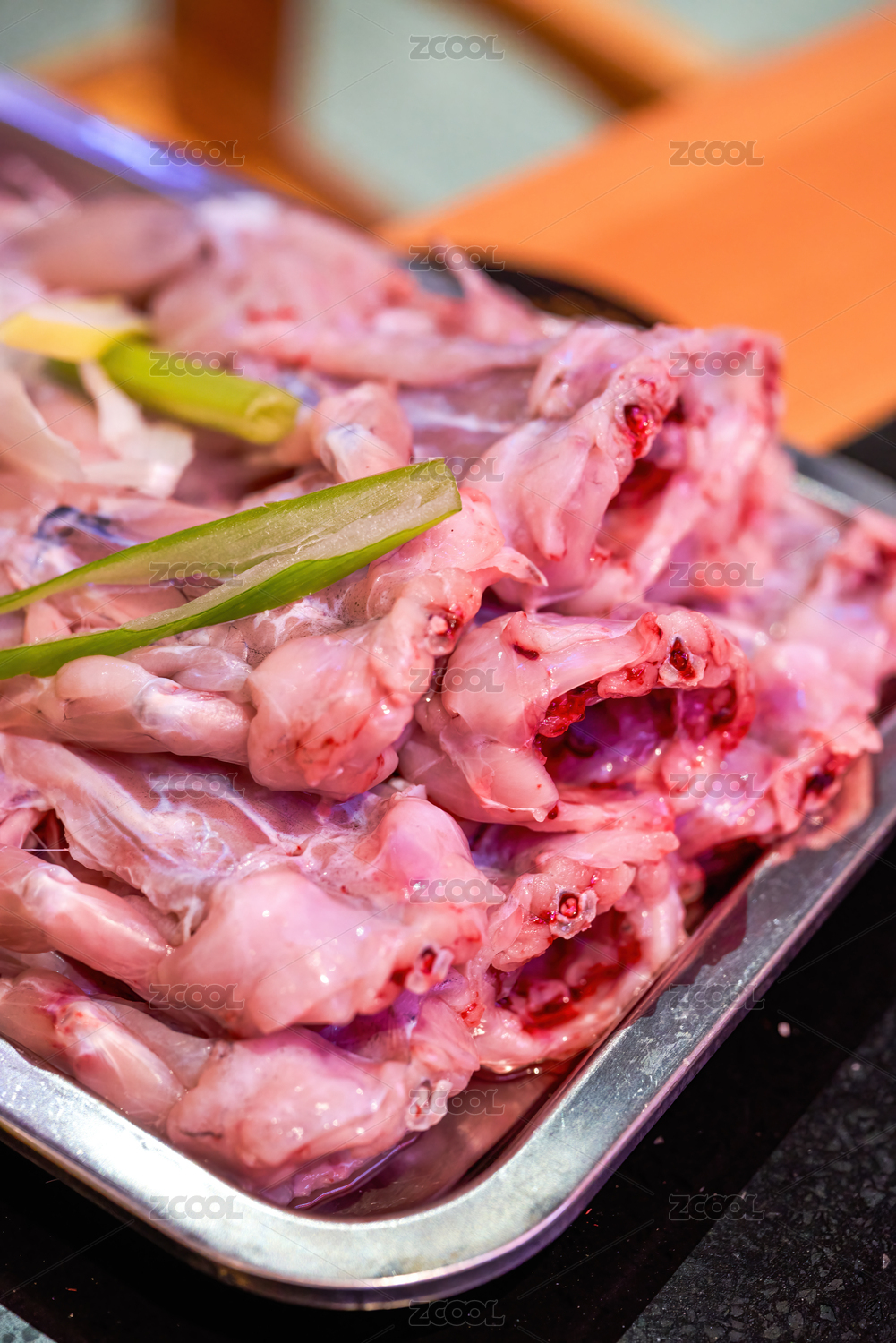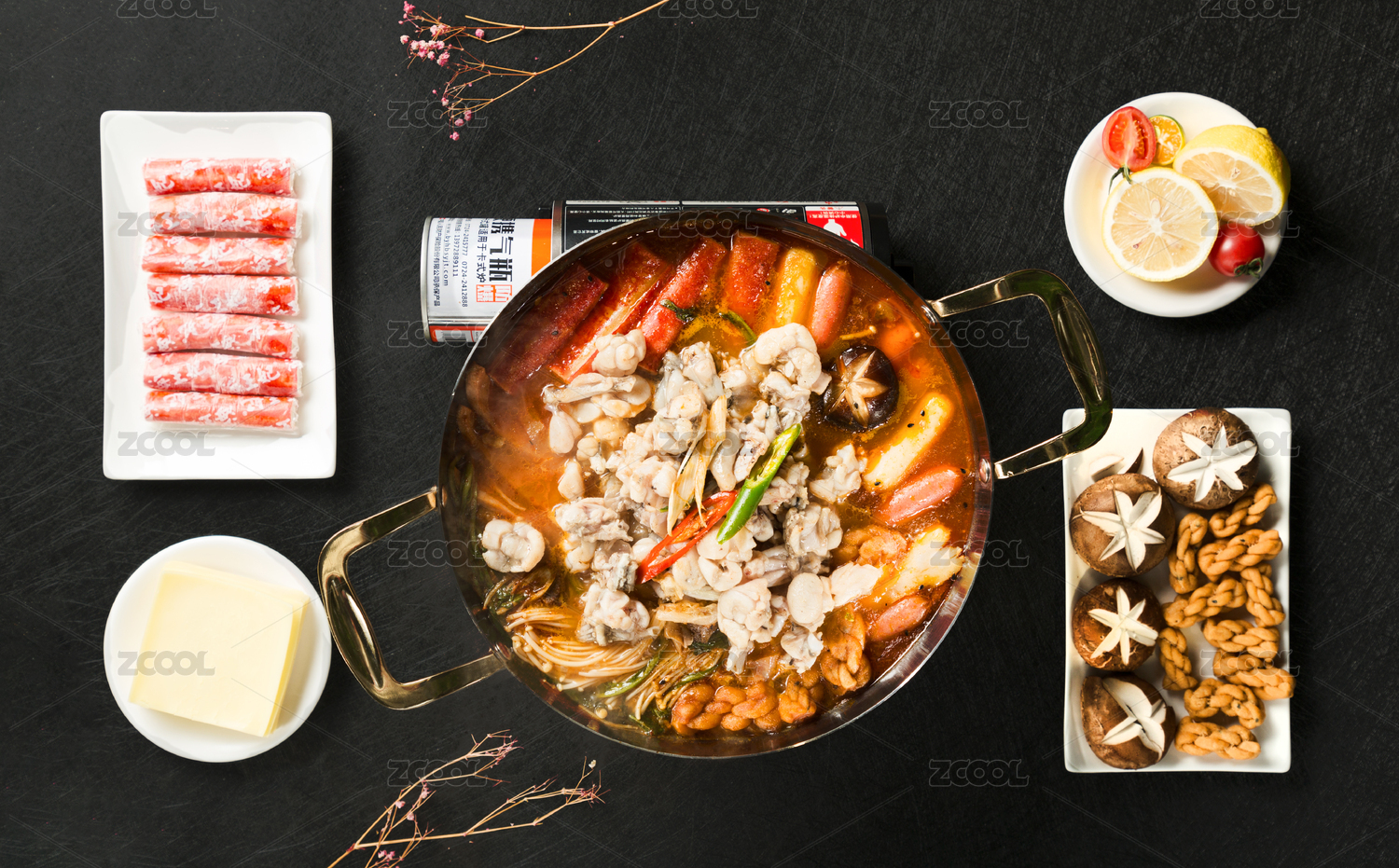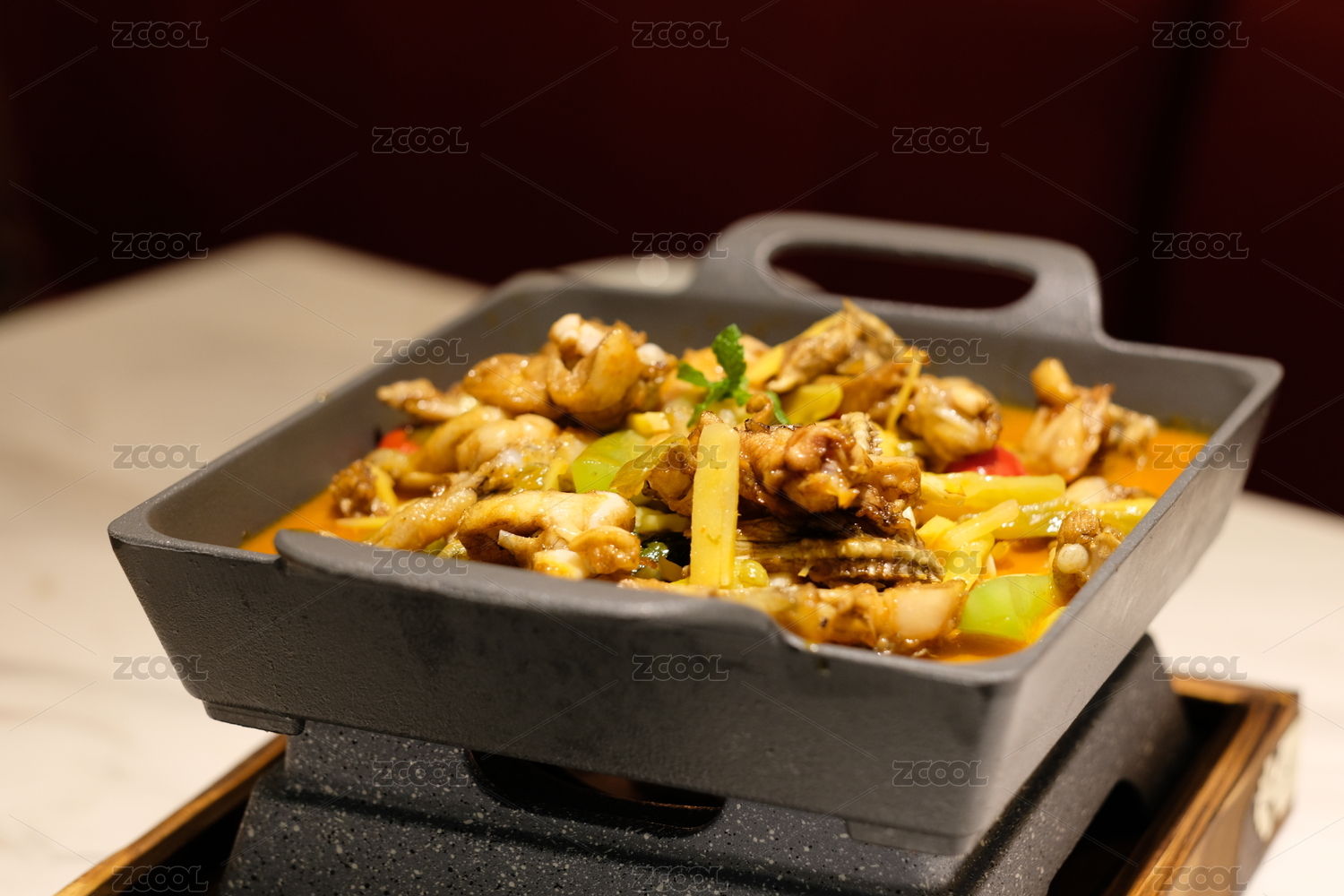 晚餐餐桌上的一锅牛蛙火锅的特写