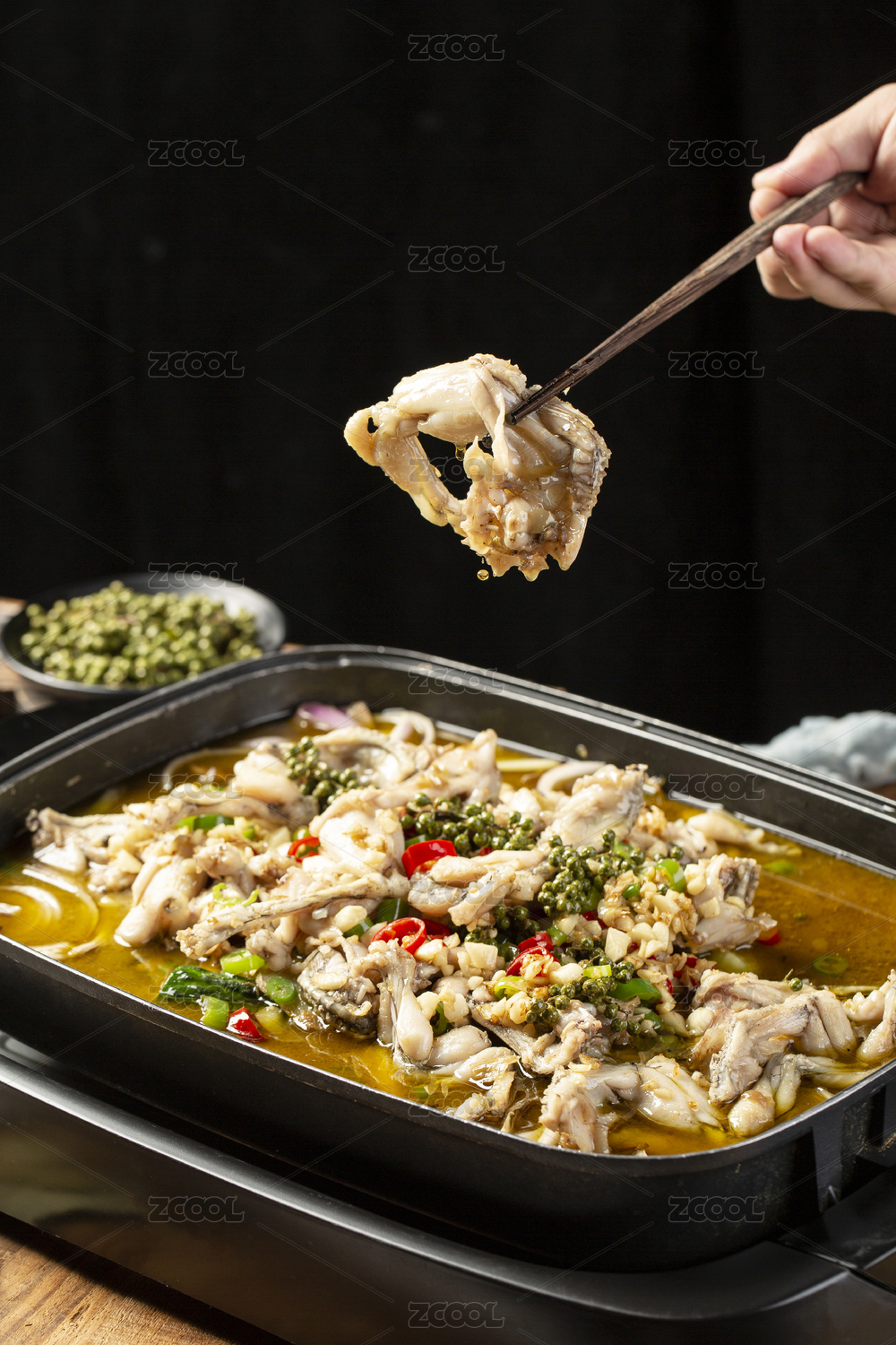 黑色背景上黑色砂锅里冒着热气的牛蛙火锅