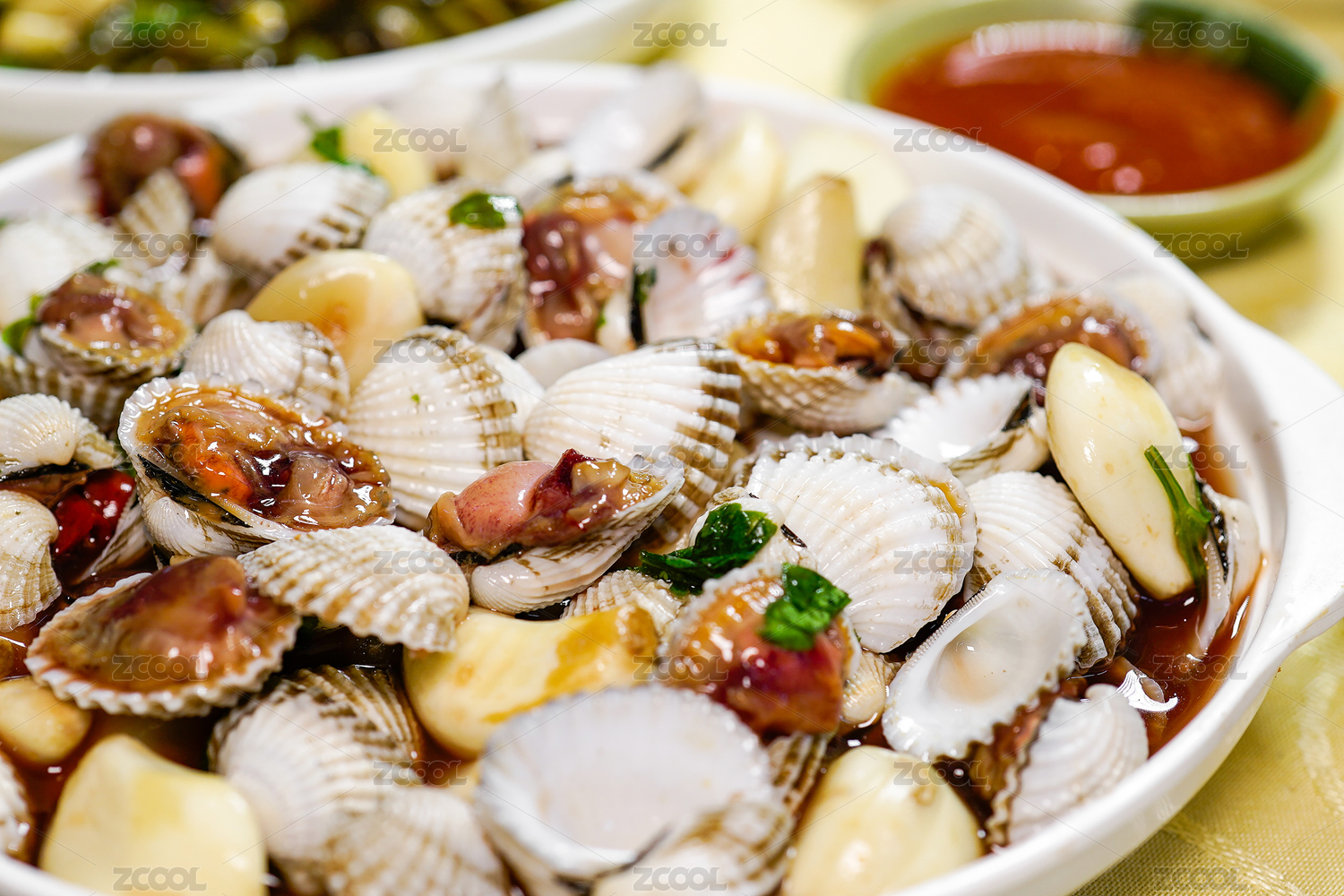 白盘装潮汕美食生腌血蛤局部特写