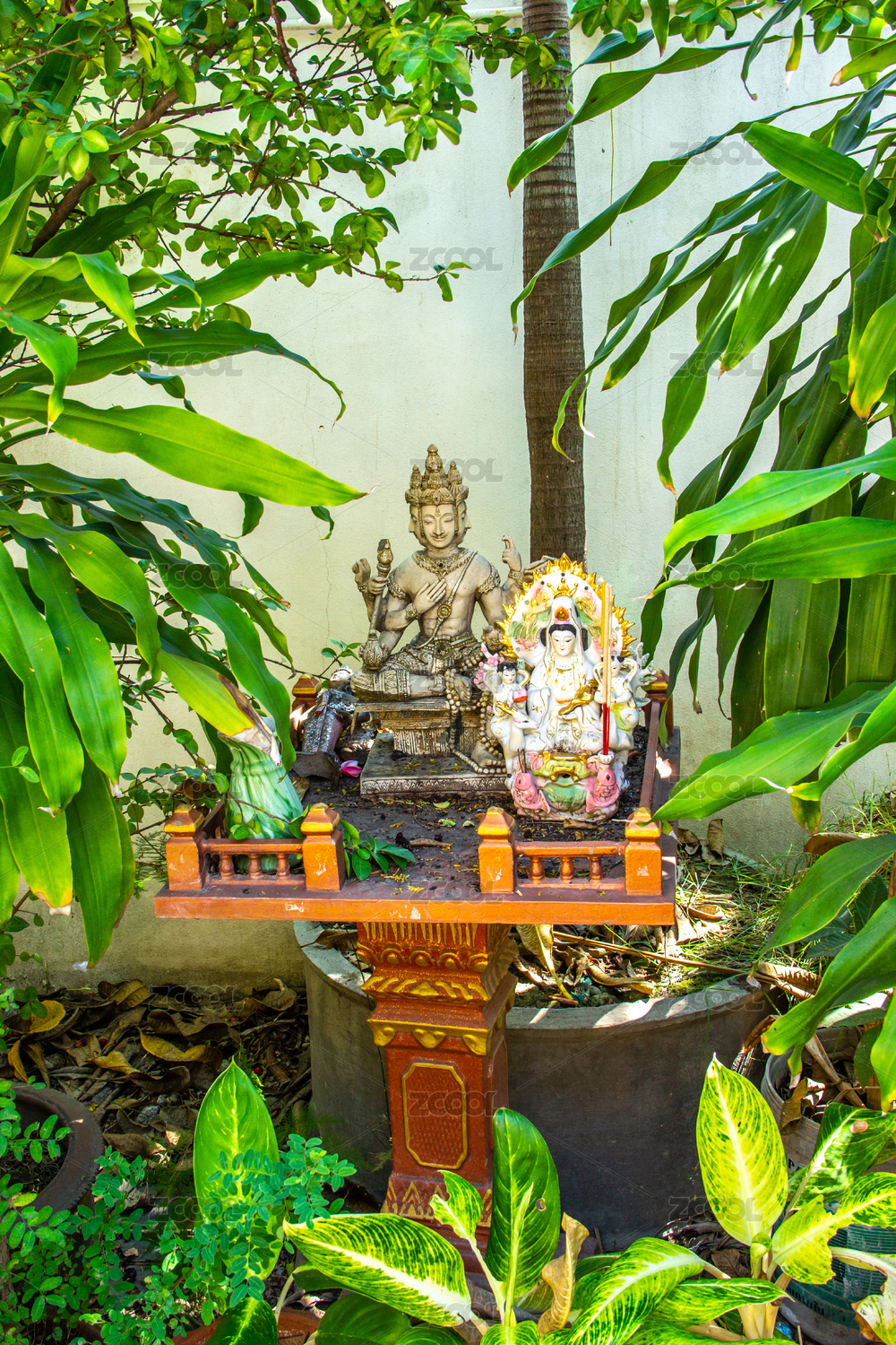 泰国寺庙供奉三面佛和观音像的神龛神台