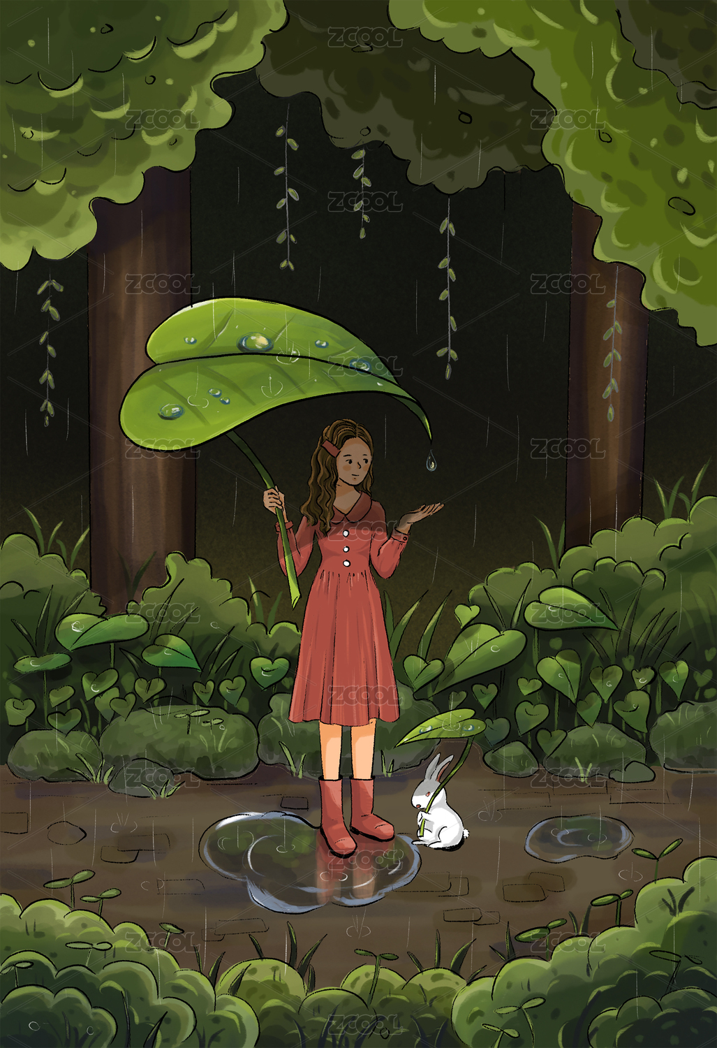 宫崎俊风插画雨夜中的红衣少女