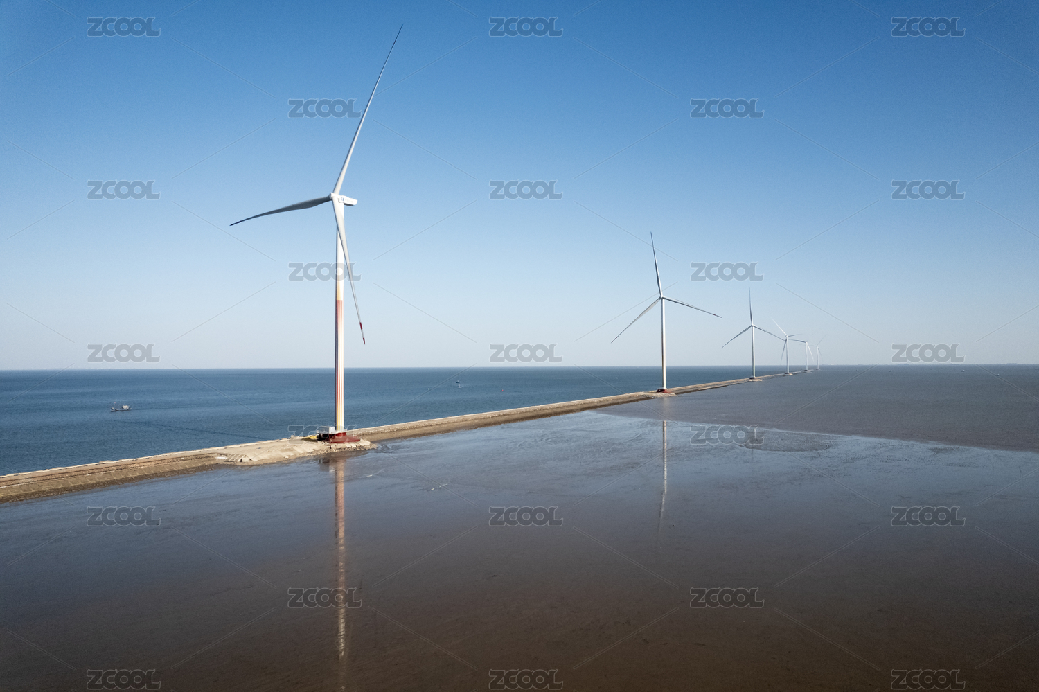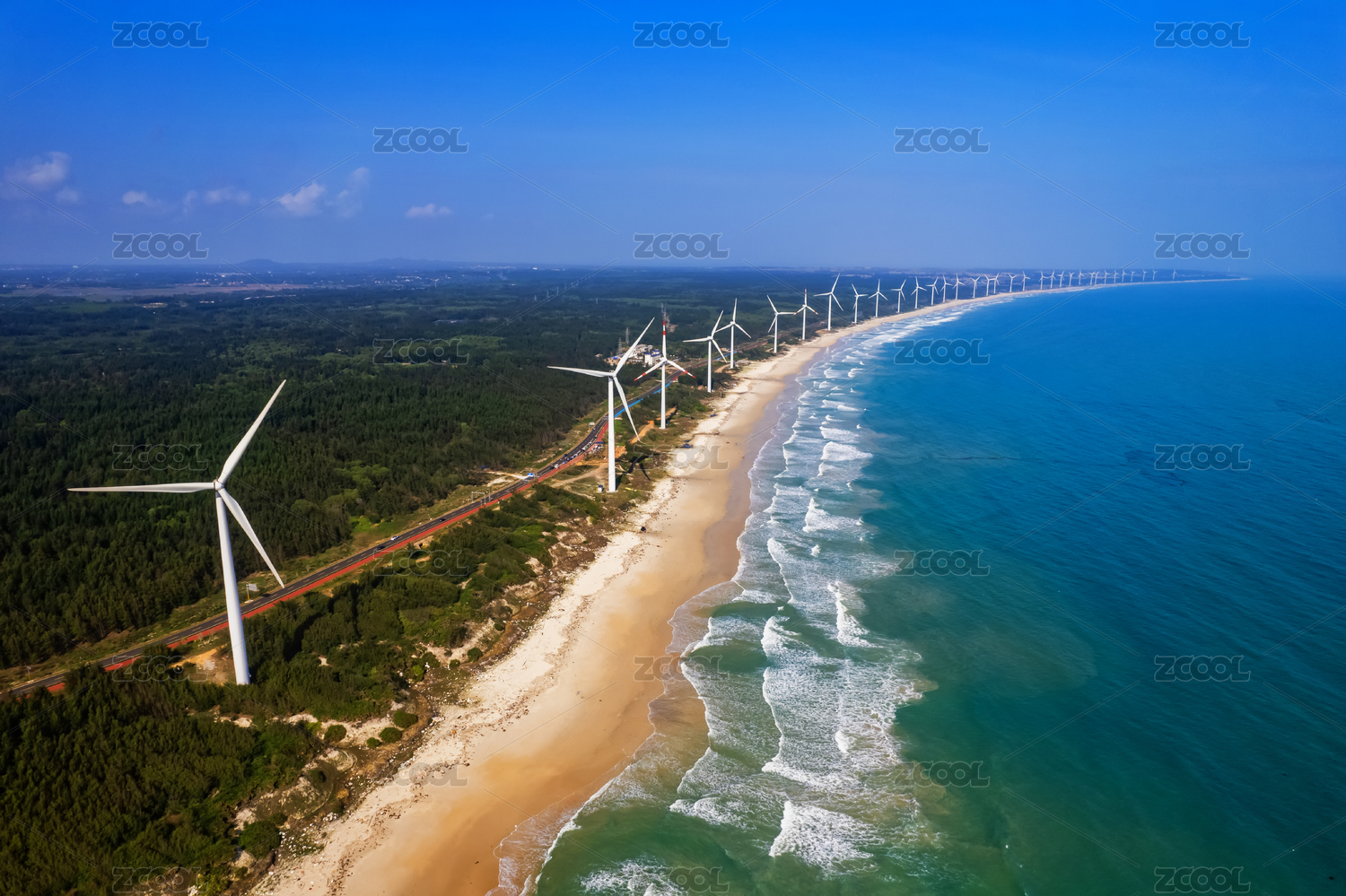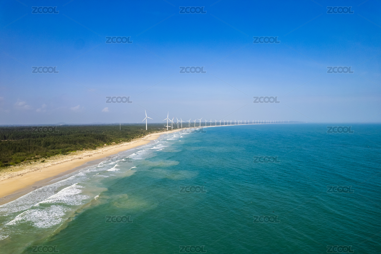 俯瞰海口沙滩海岸边排成一线的风力发电机