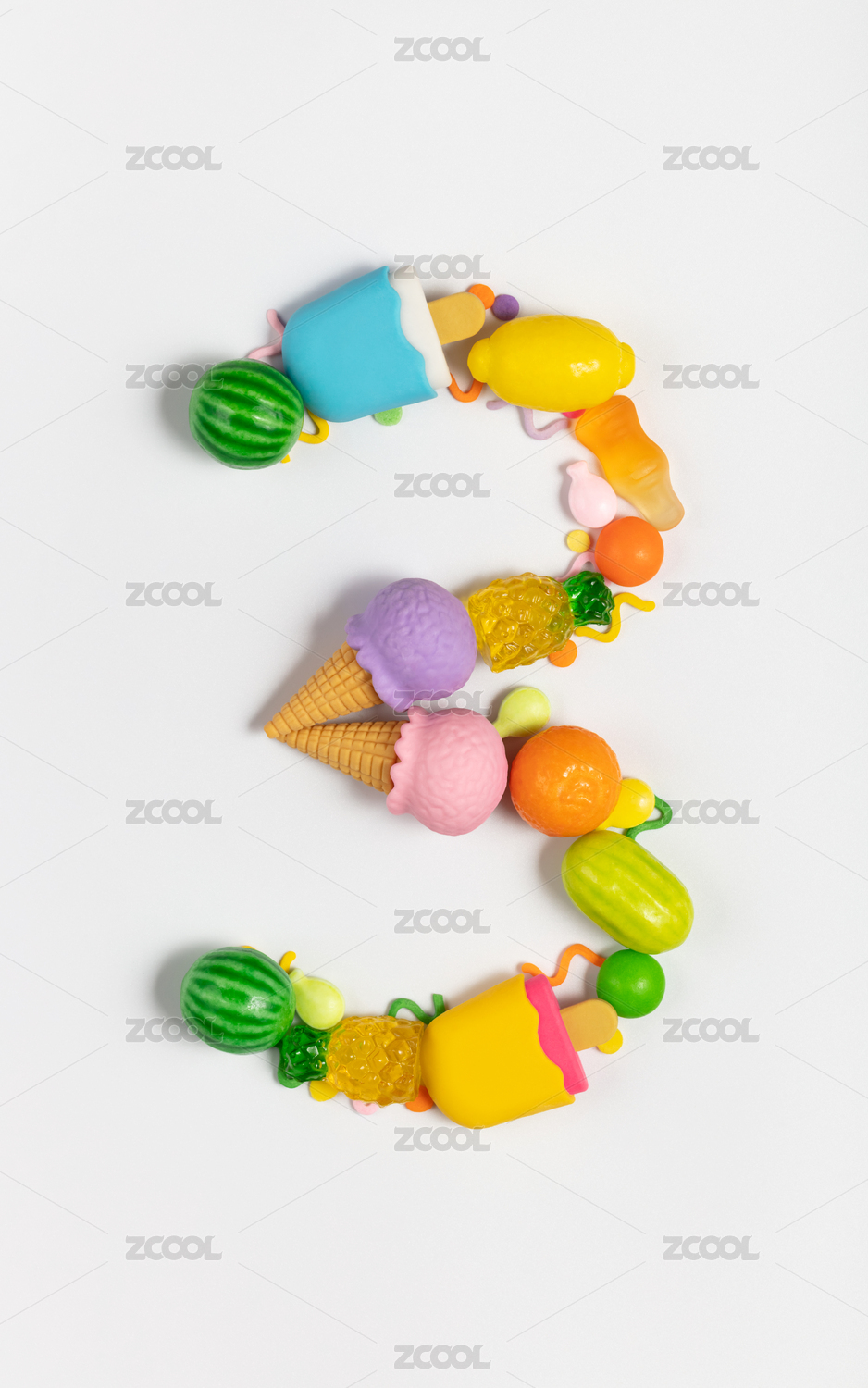 白色背景各种多样糖果组成的数字3