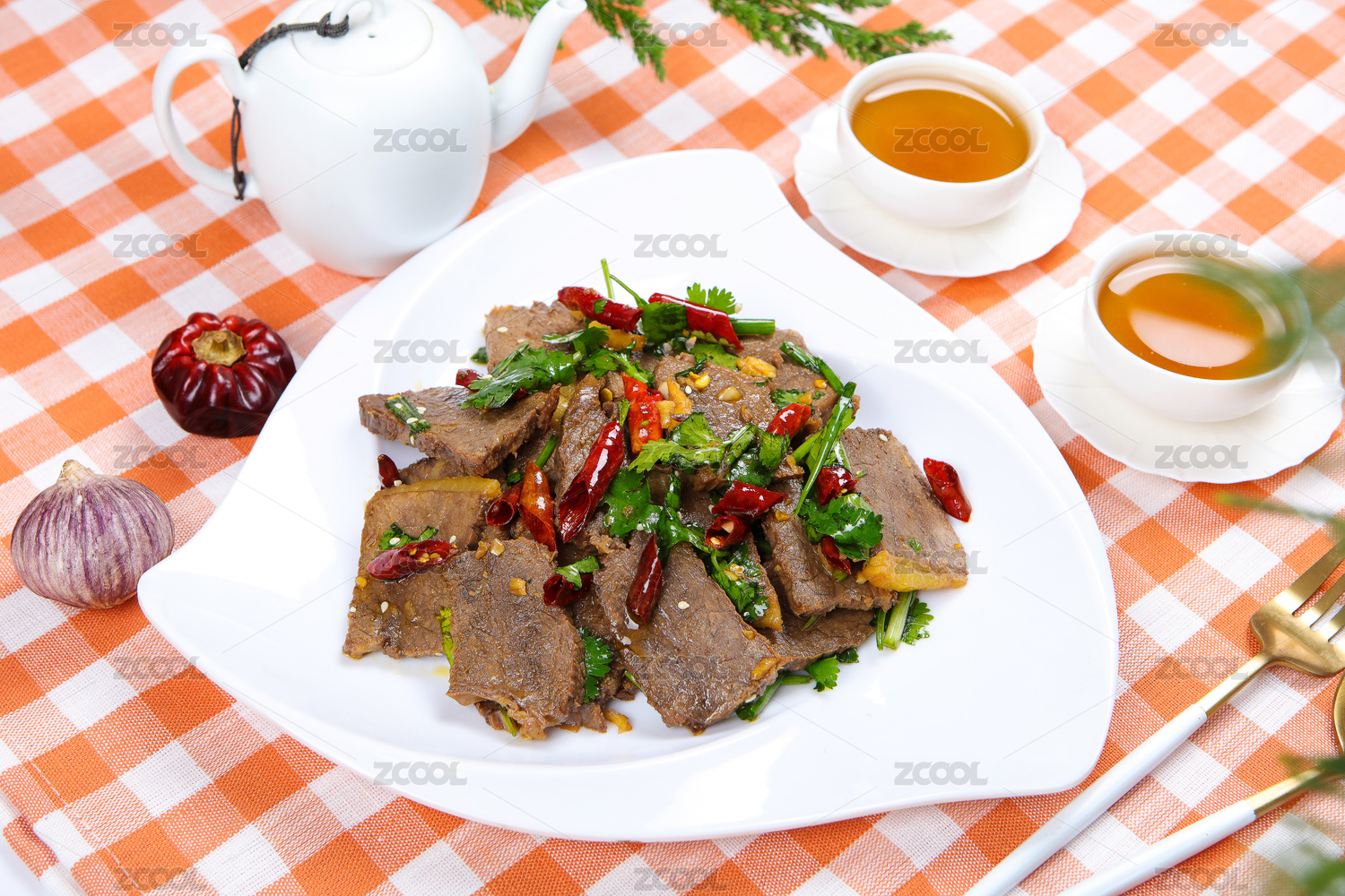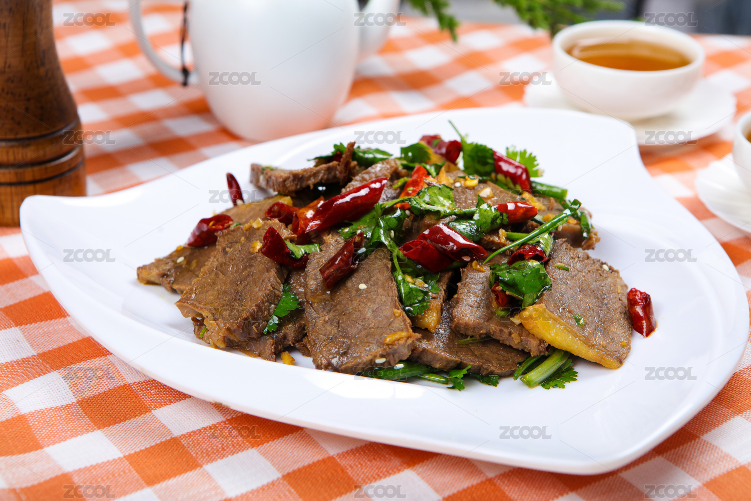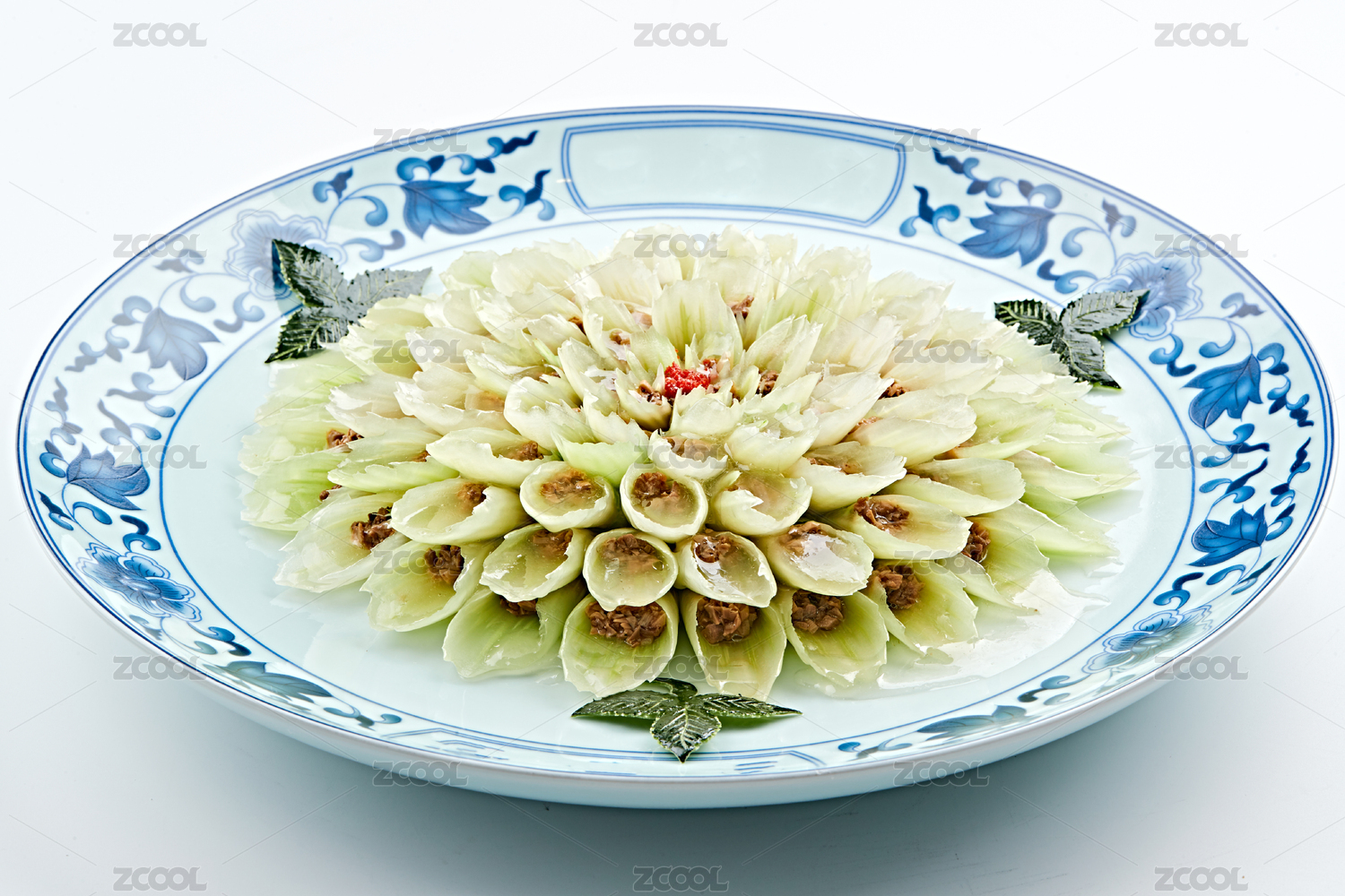 青花瓷盘装的西芹口蘑牛肉粒花开富贵迎宾菜