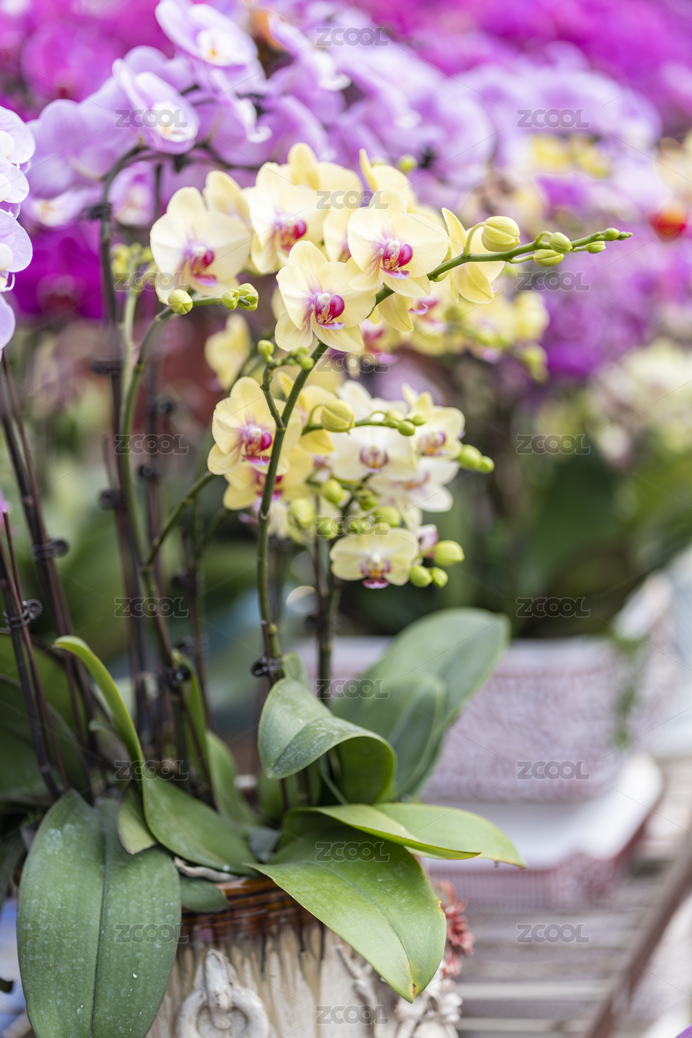 大棚内一盆黄色为主的杂色蝴蝶兰