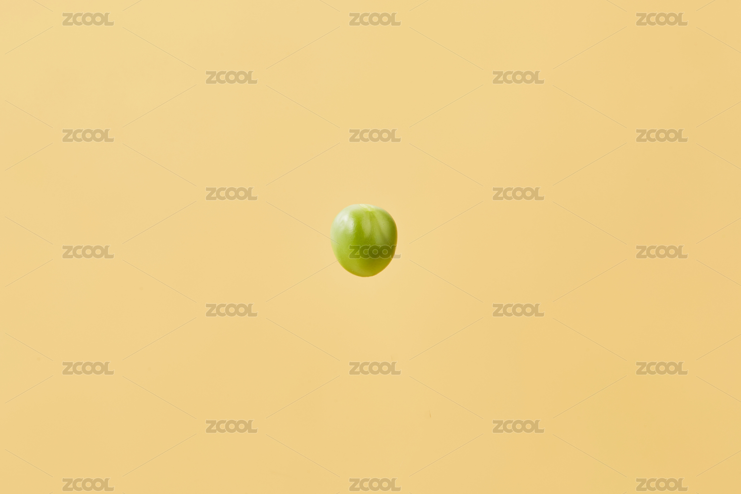 米黄色背景上悬浮的绿色豌豆