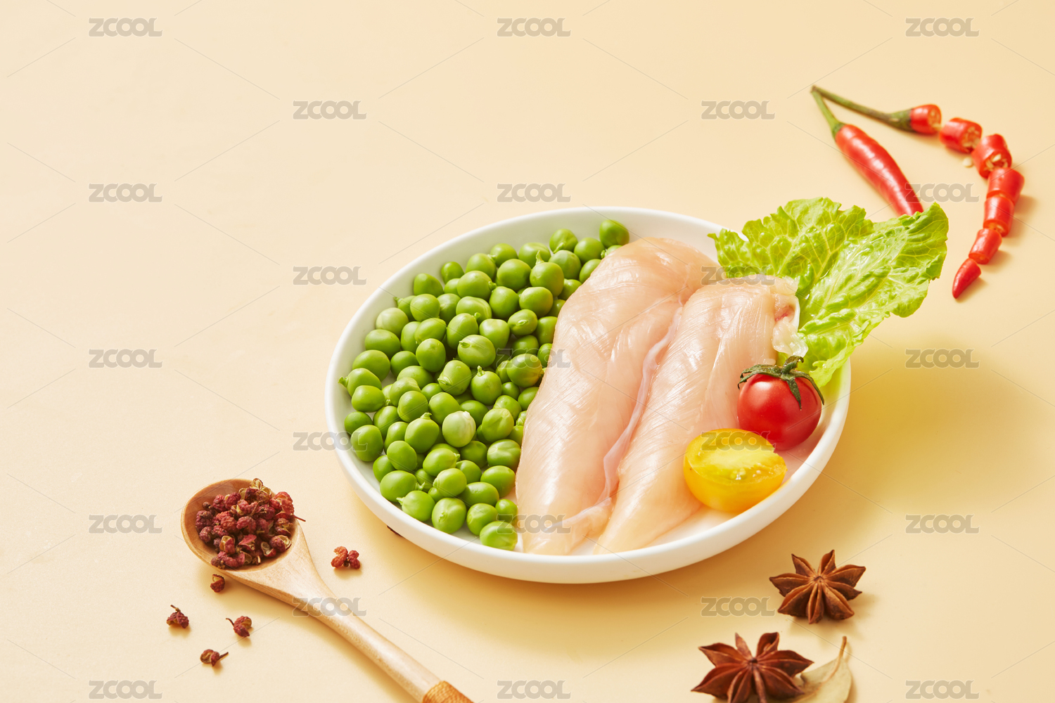 米黄色背景上的鸡胸肉和豌豆