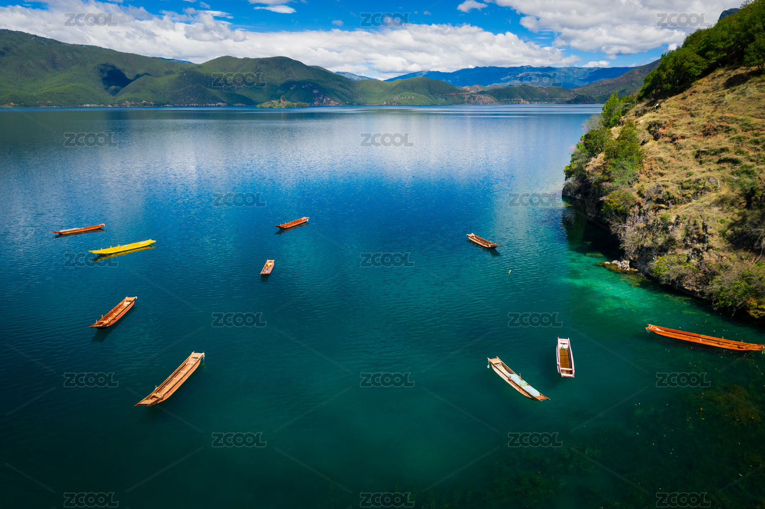 中国云南丽江泸沽湖女神湾船只自然风光美景