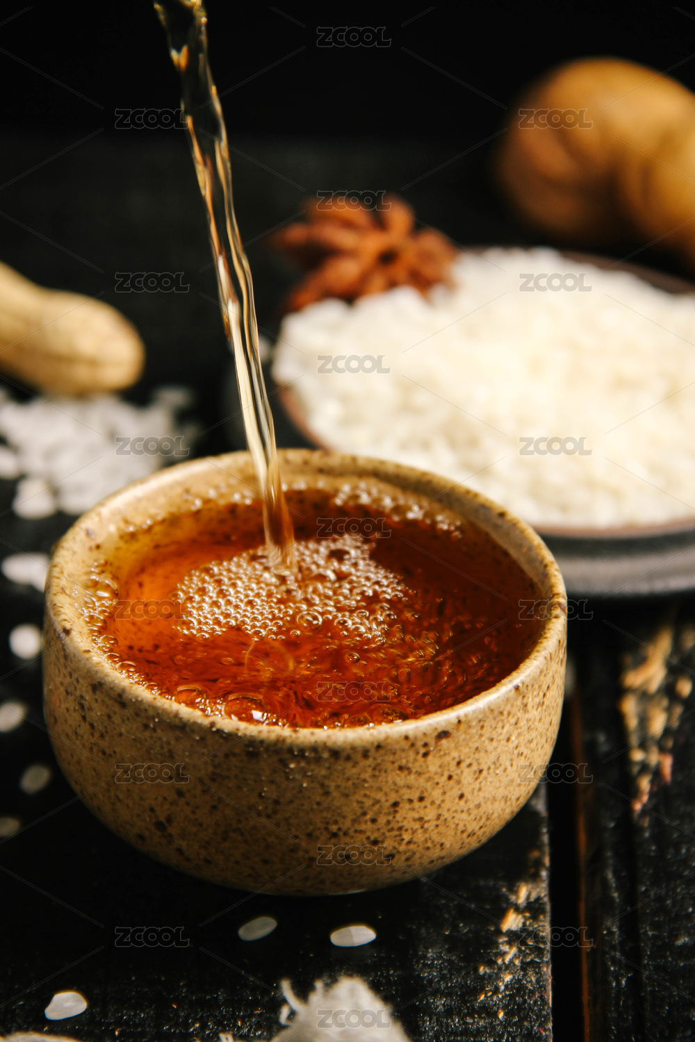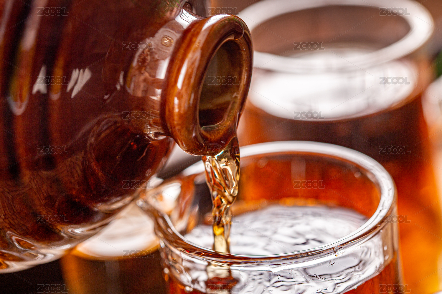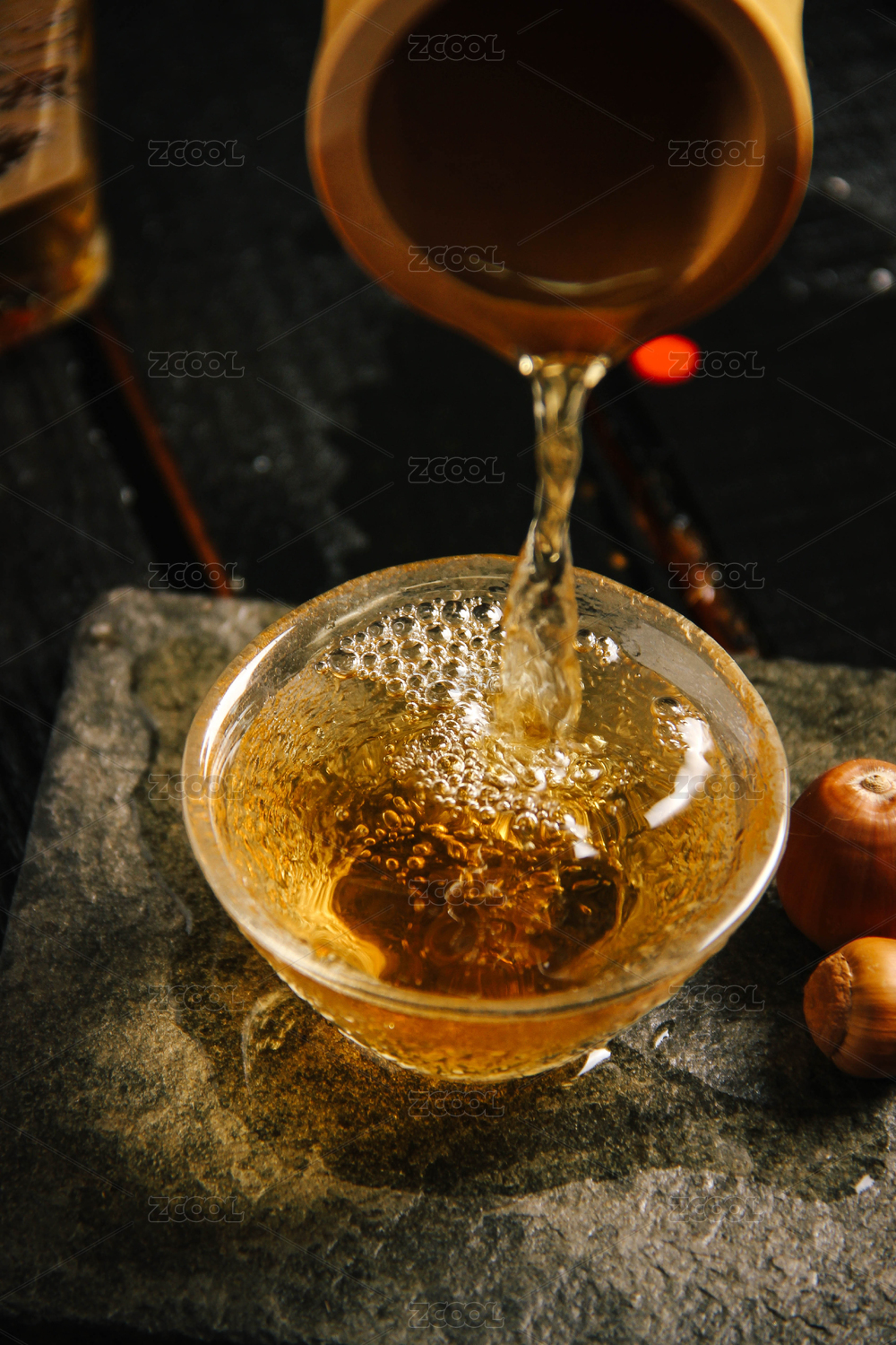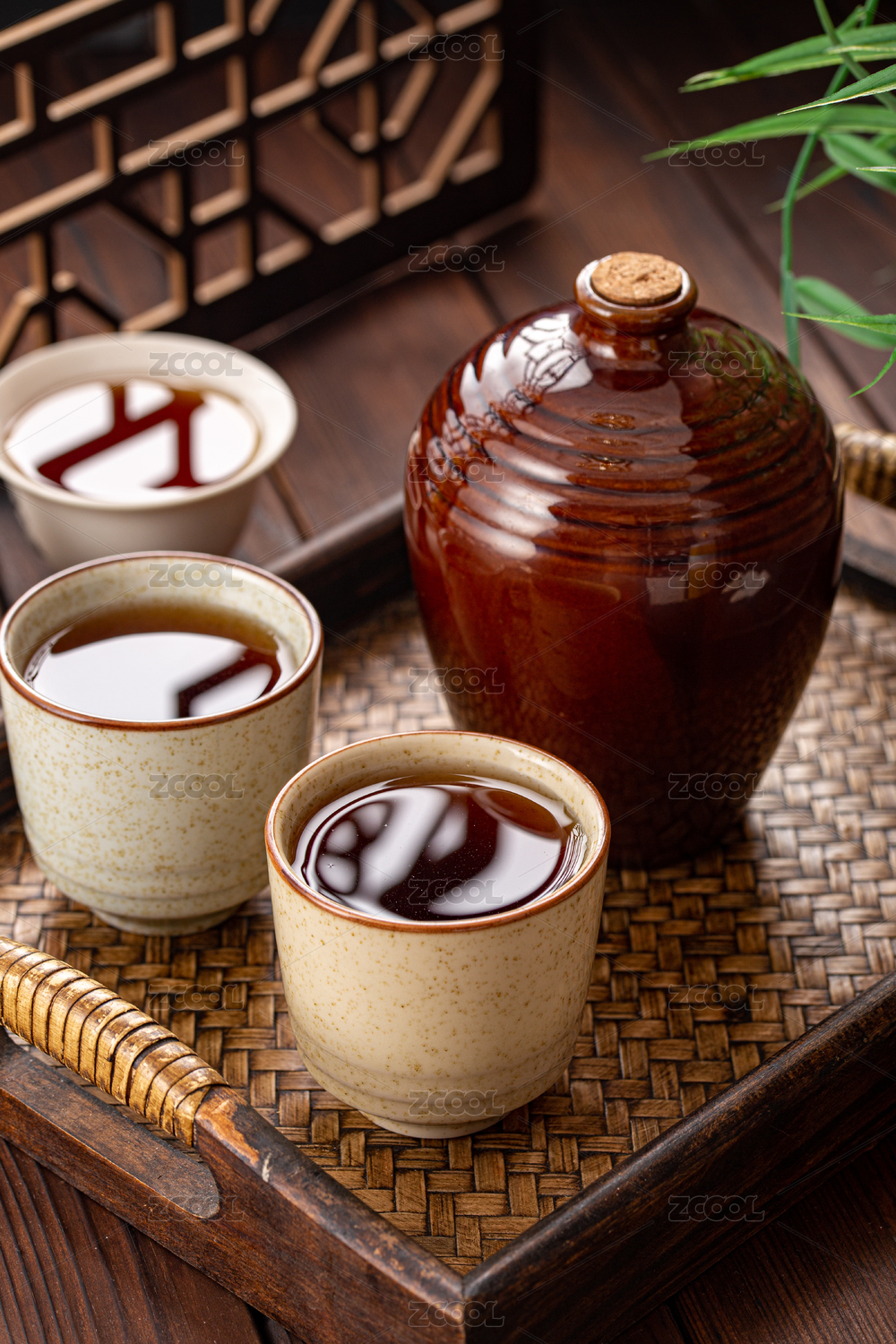 木质桌面上从竹筒里倒出黄酒到杯子里