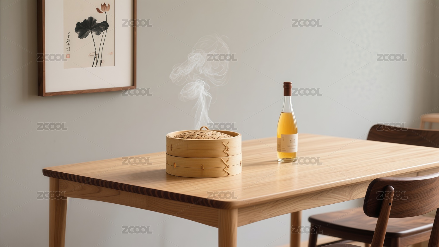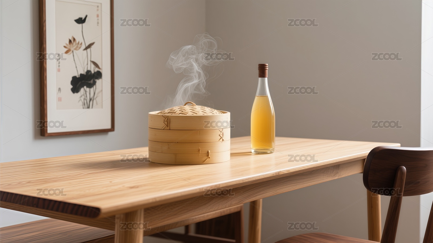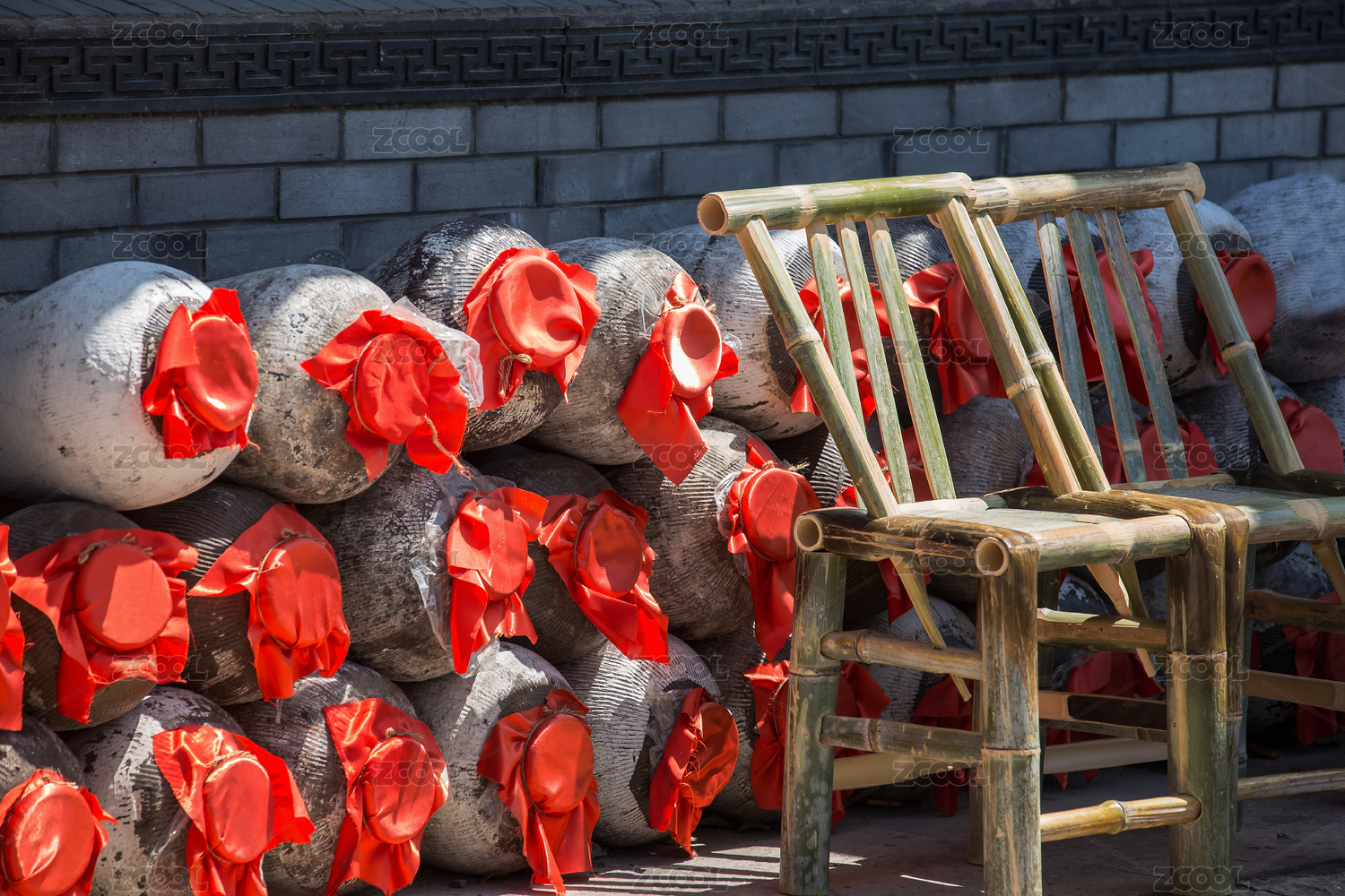 木质桌面上从竹筒里倒出黄酒到杯子里