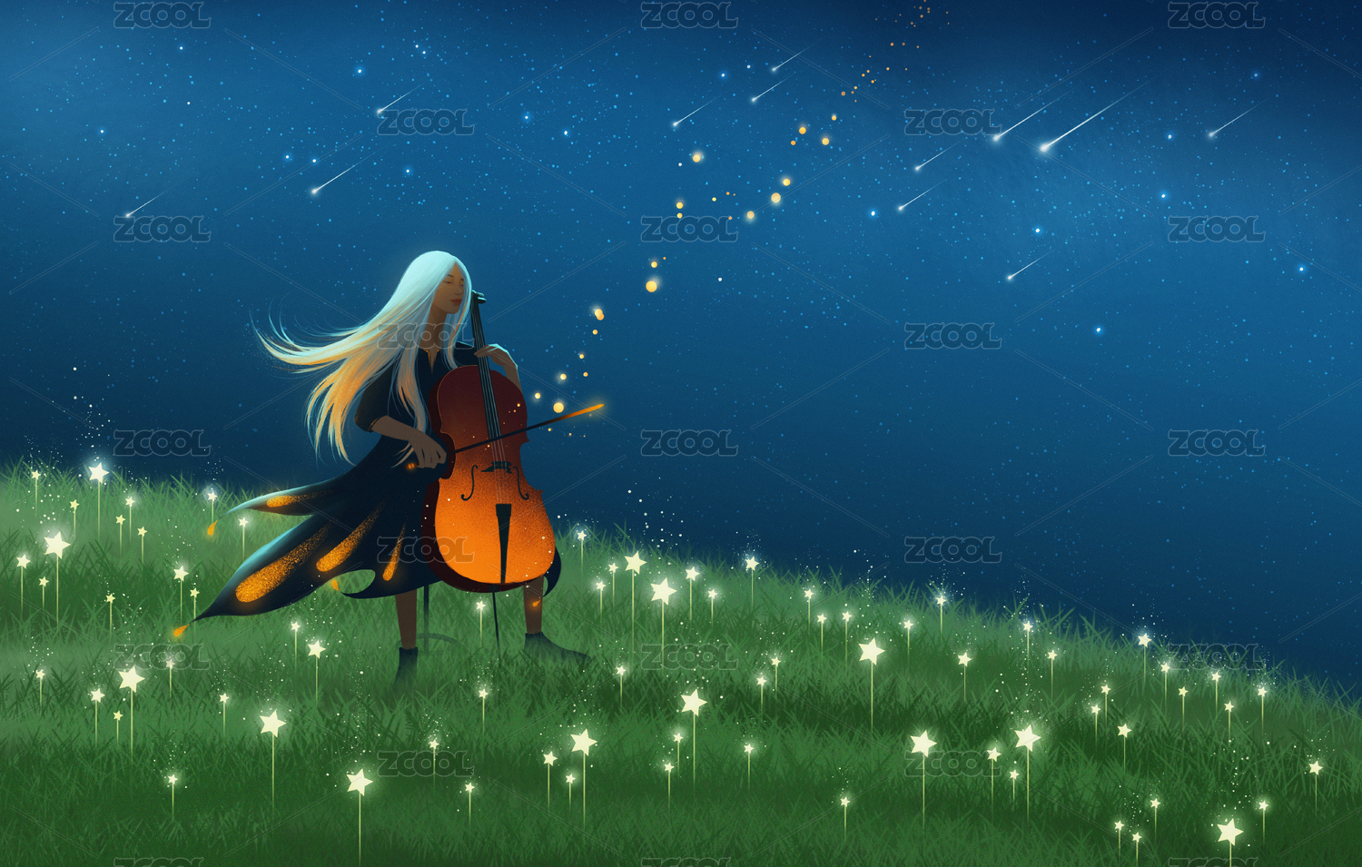 晴朗的天空下,美丽少女在茂盛的草坪斜坡上演奏大提琴插画背景海报
