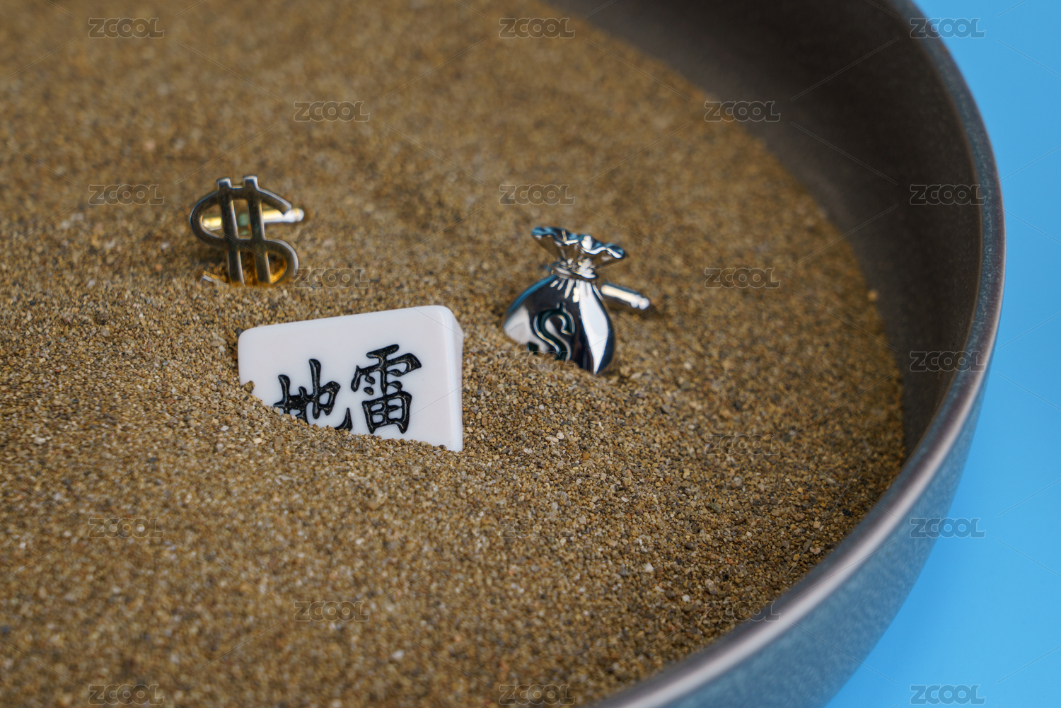 埋在砂子中可能引爆的地雷和货币符号微缩创