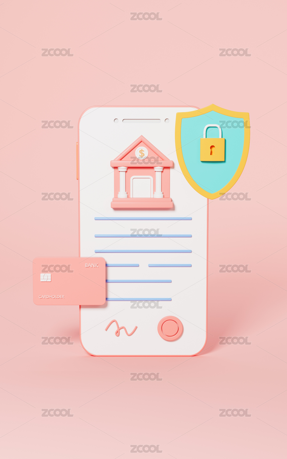 手机银行和盾牌防护3D渲染