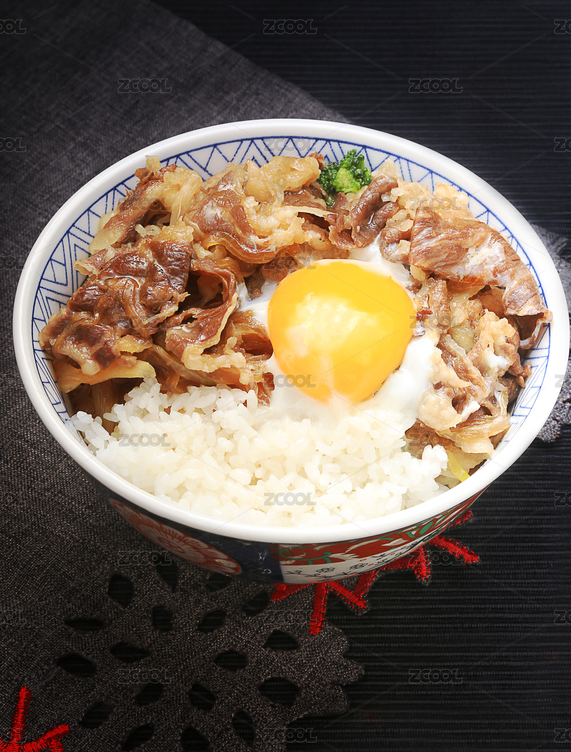灰色餐布上日式瓷碗中的澳洲肥牛饭