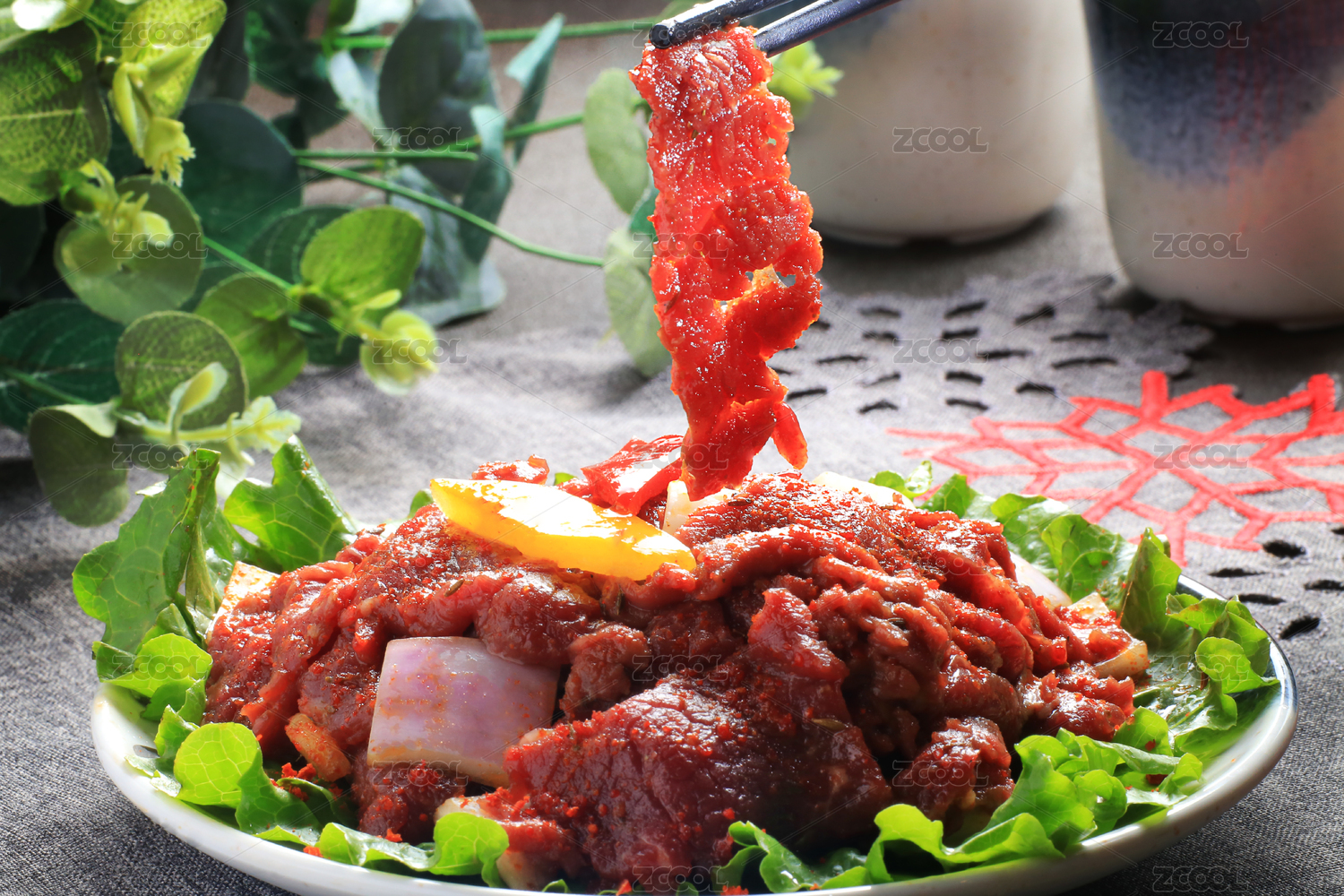 灰色餐布上的一盘腌牛肉,用筷子夹起