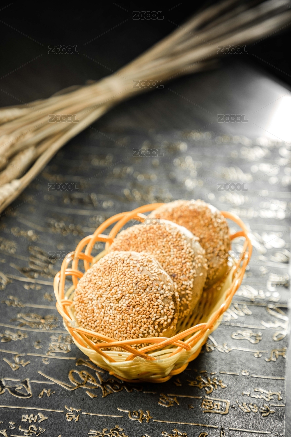 带有汉字的餐布上放着一篮芝麻酱烧饼