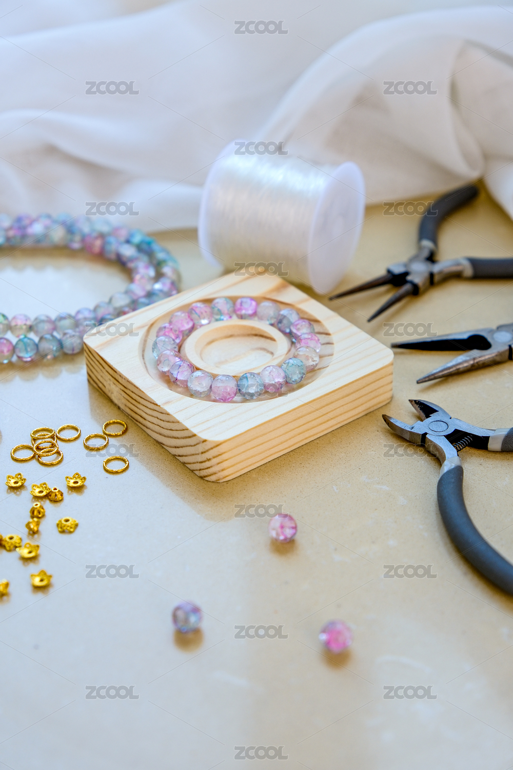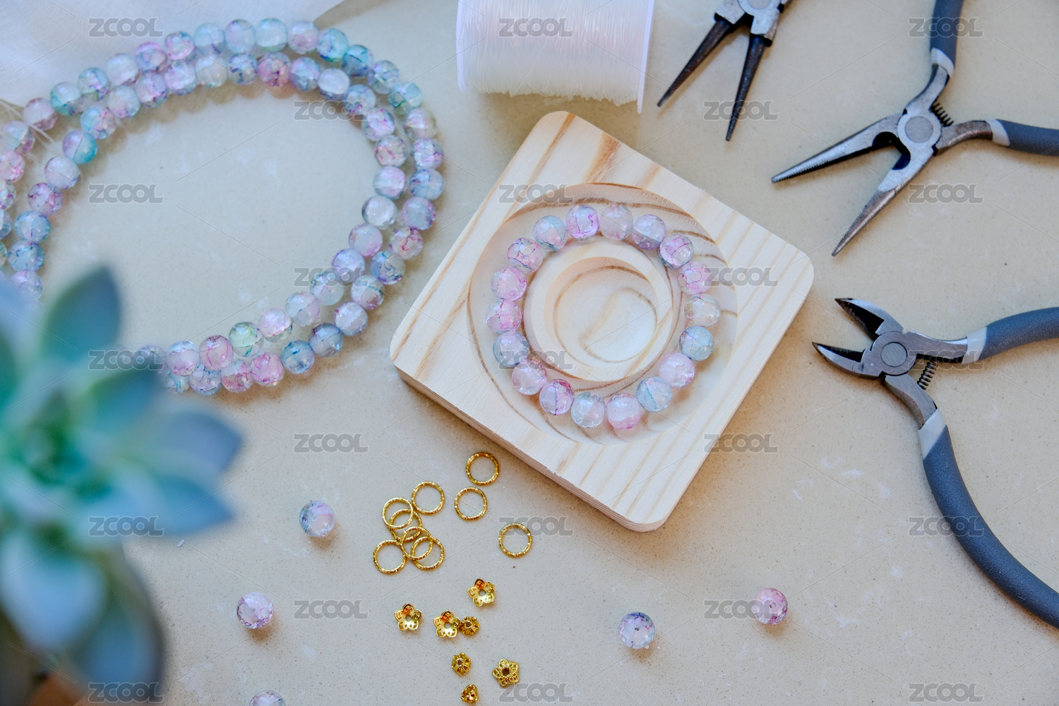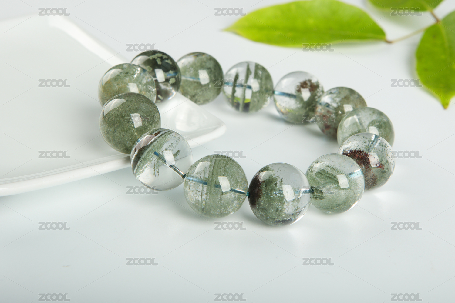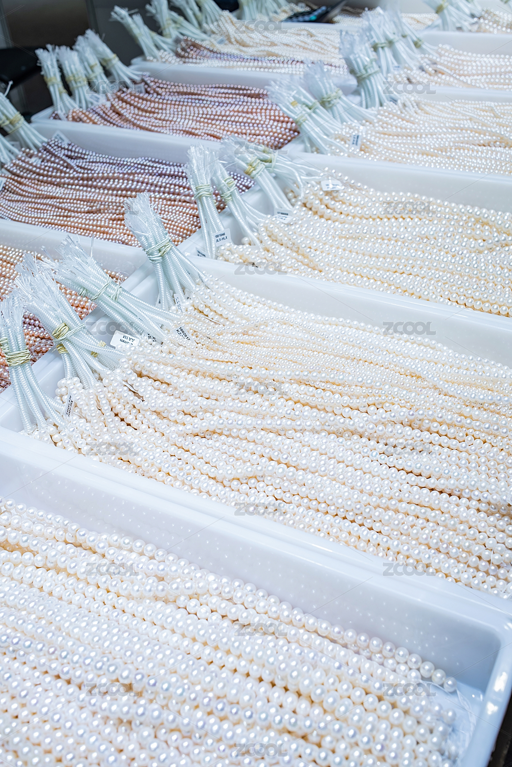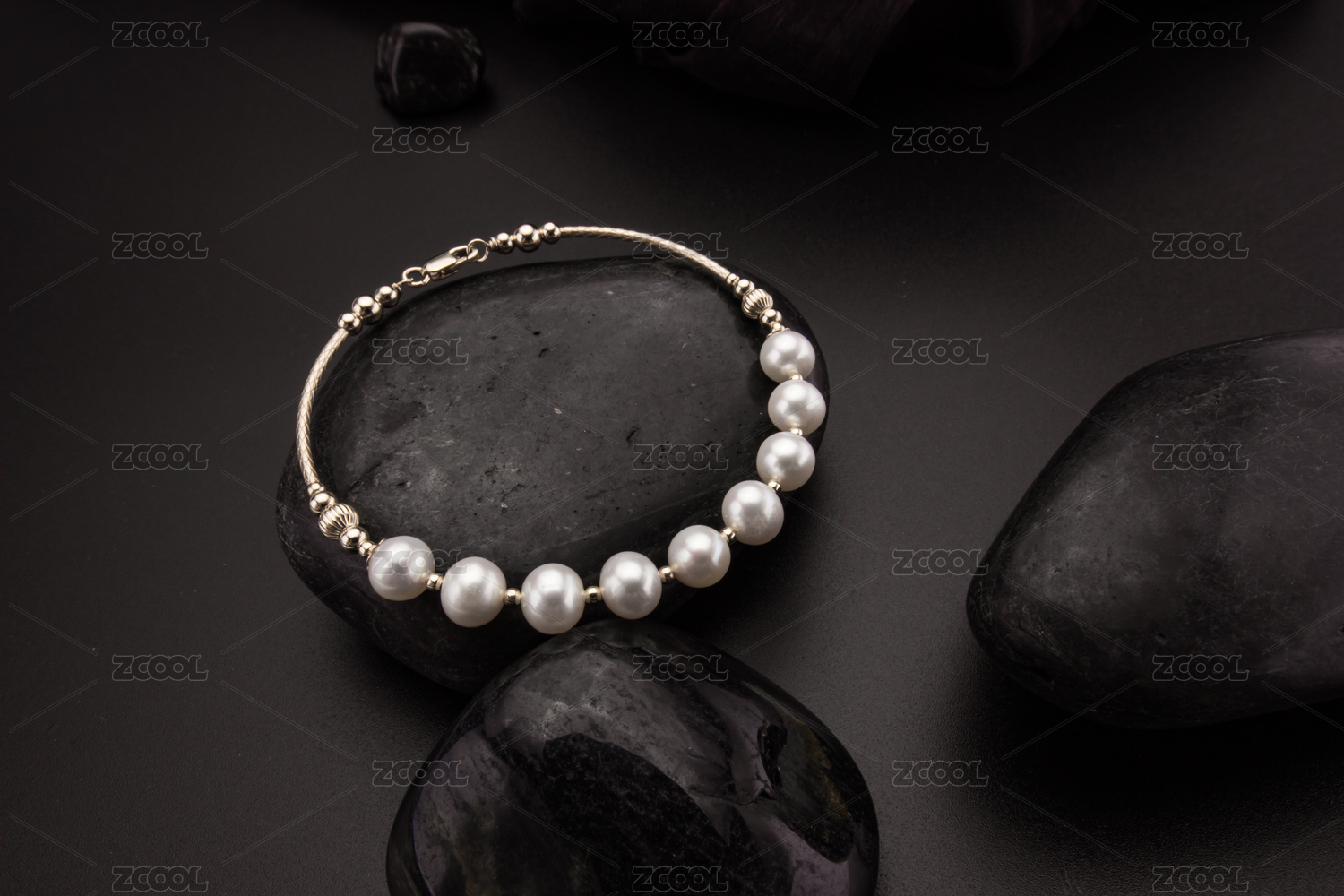 亮白的珍珠串珠与黑色鹅卵石放在深色的背景中