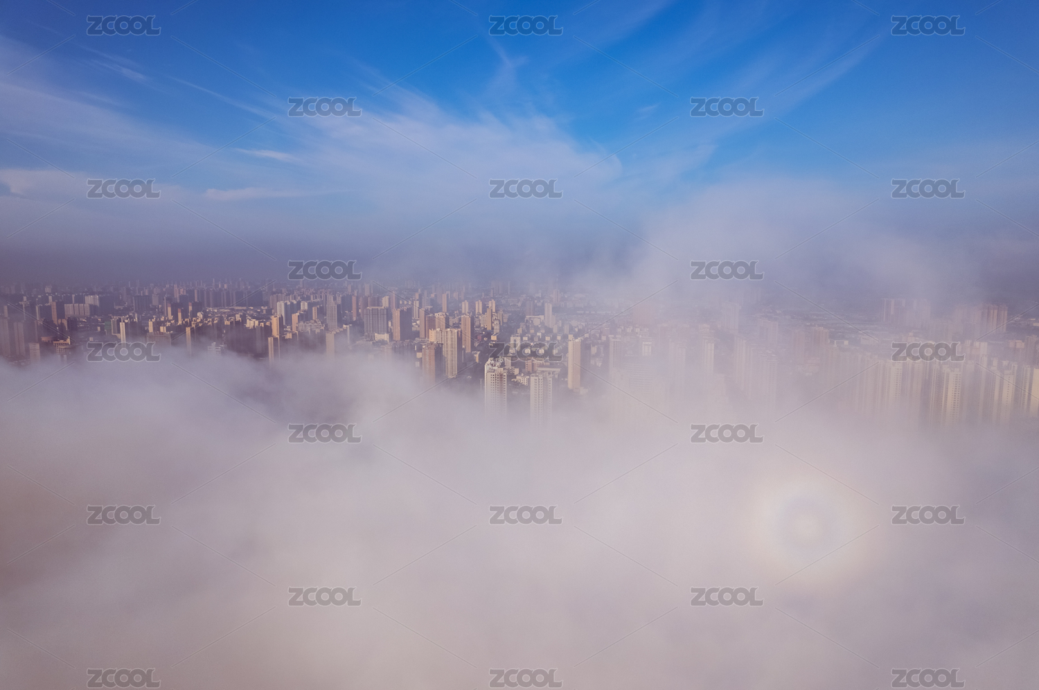 航拍高空俯瞰城市高楼建筑在云雾中若隐若现