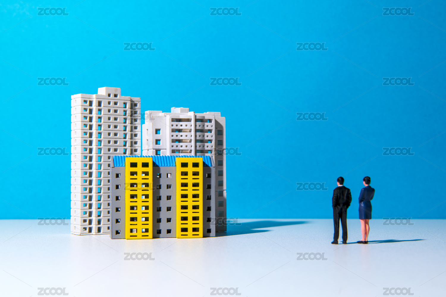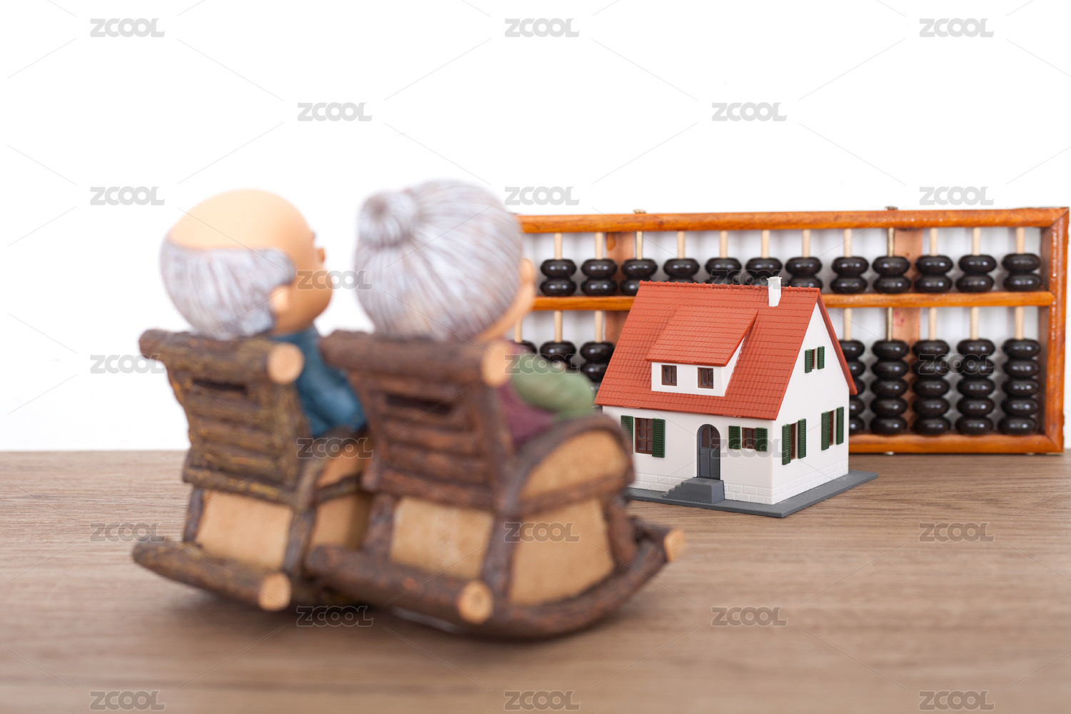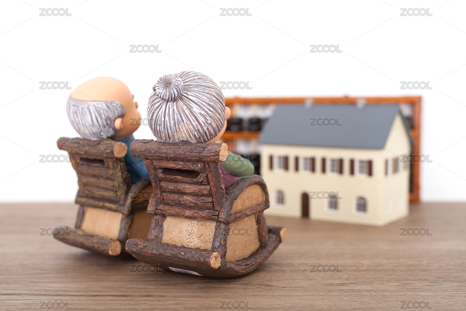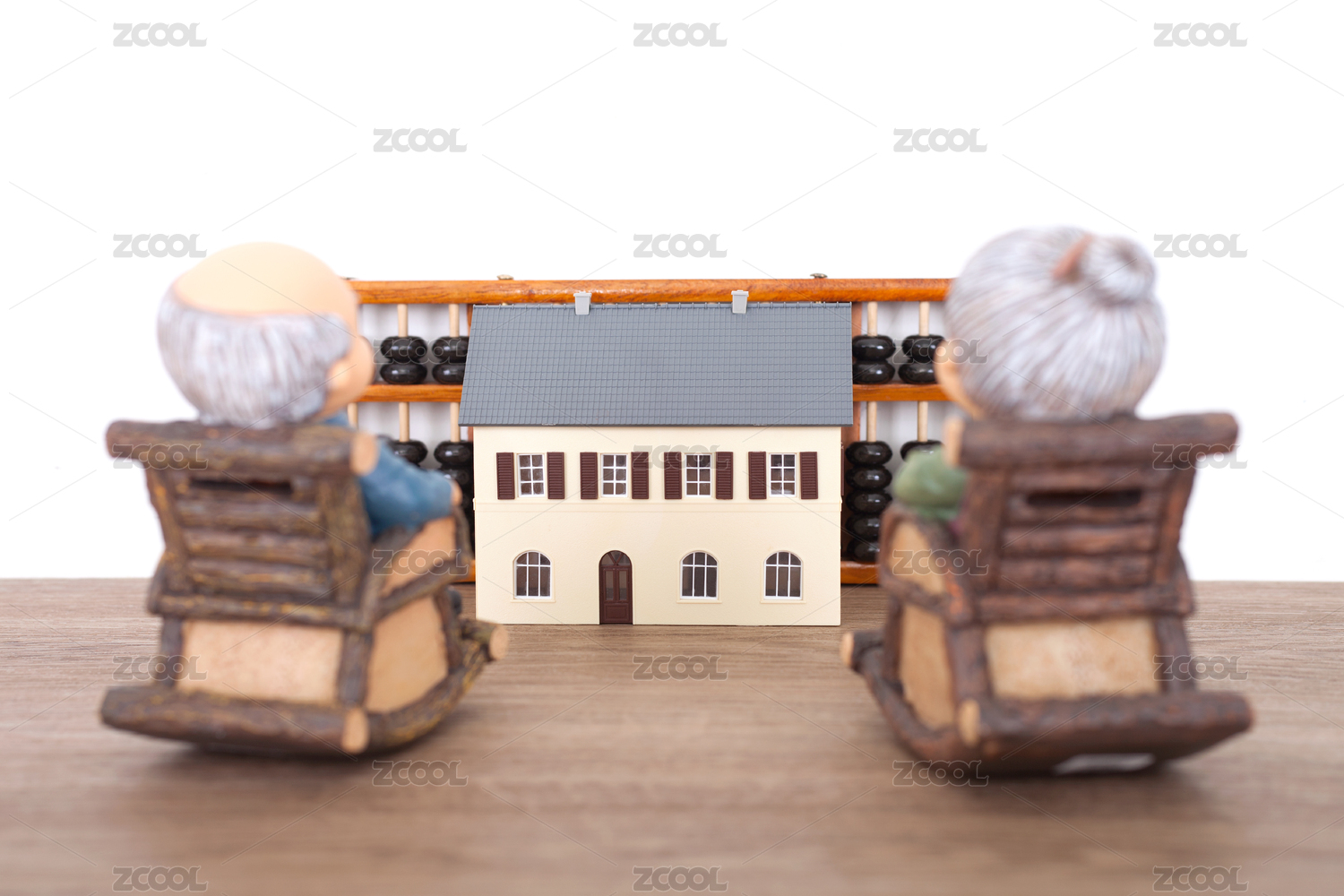 坐着摇椅的老奶奶和老爷爷看着远处的房子模型和算珠工具