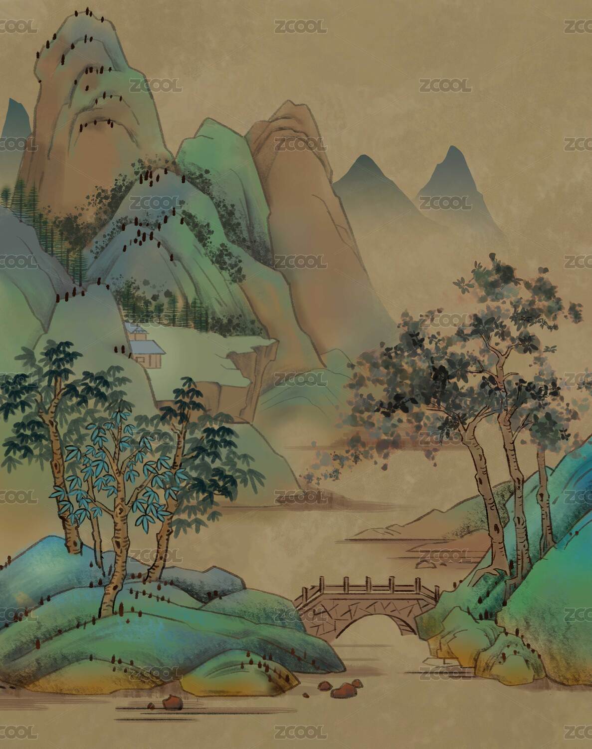 青绿山水国画风山