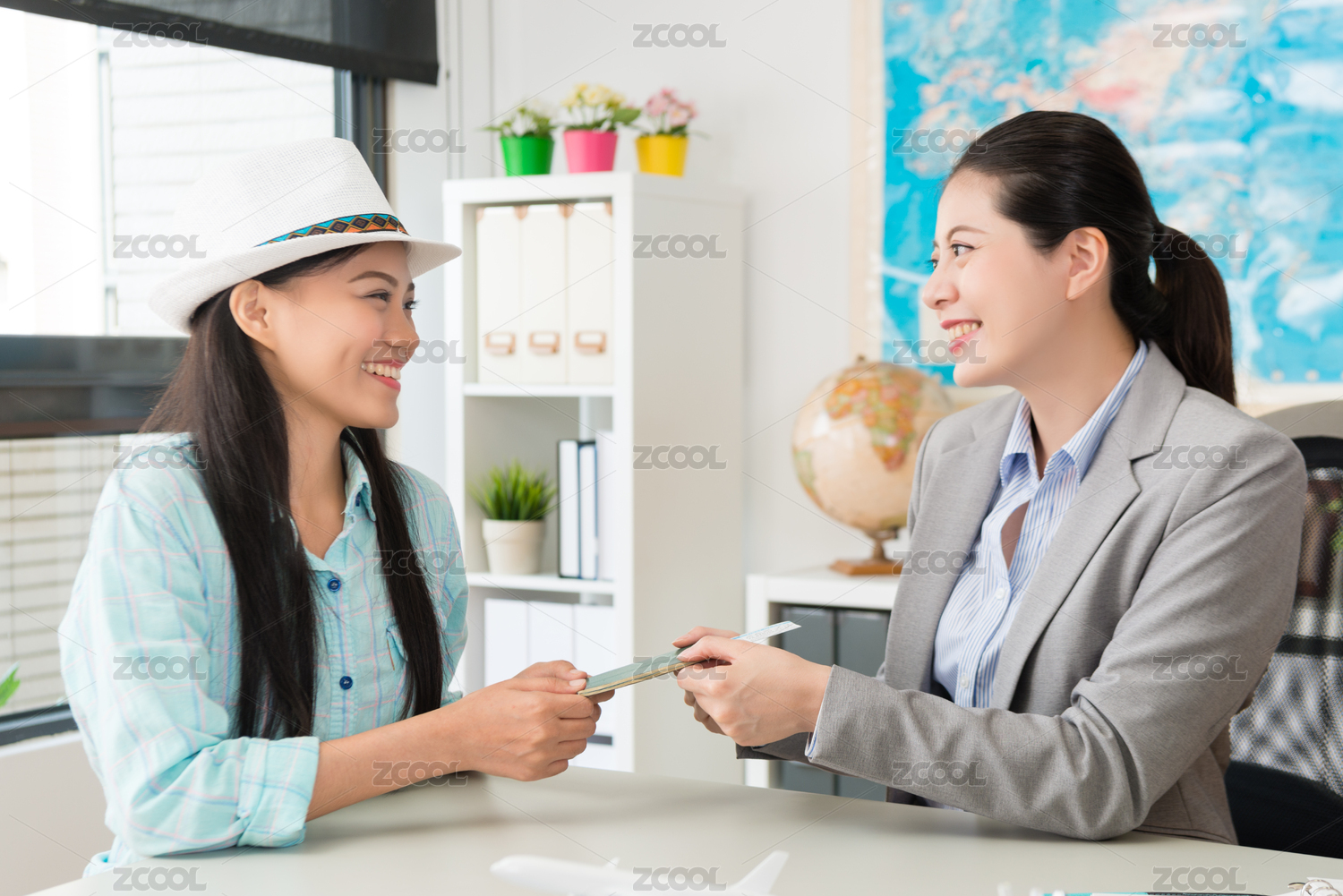 专业年轻的旅行社公司上班族女人给人护照机票为她的客户的旅客。