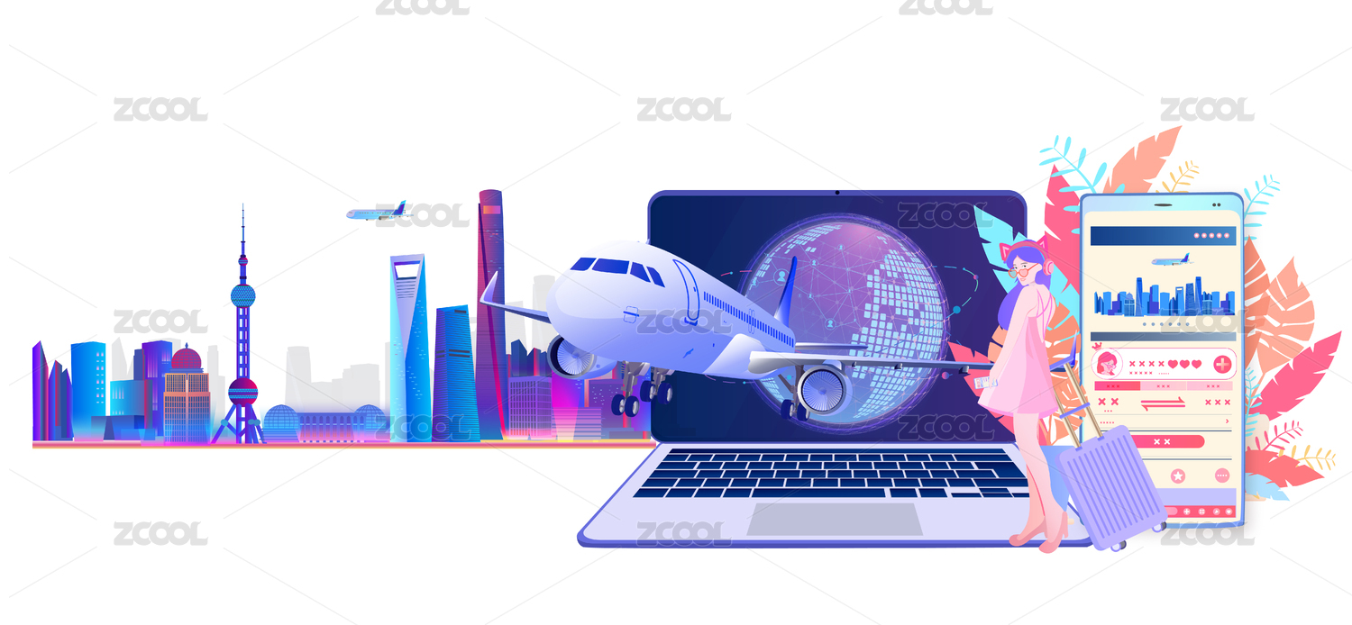 美女用手机购买机票飞去上海旅游插画