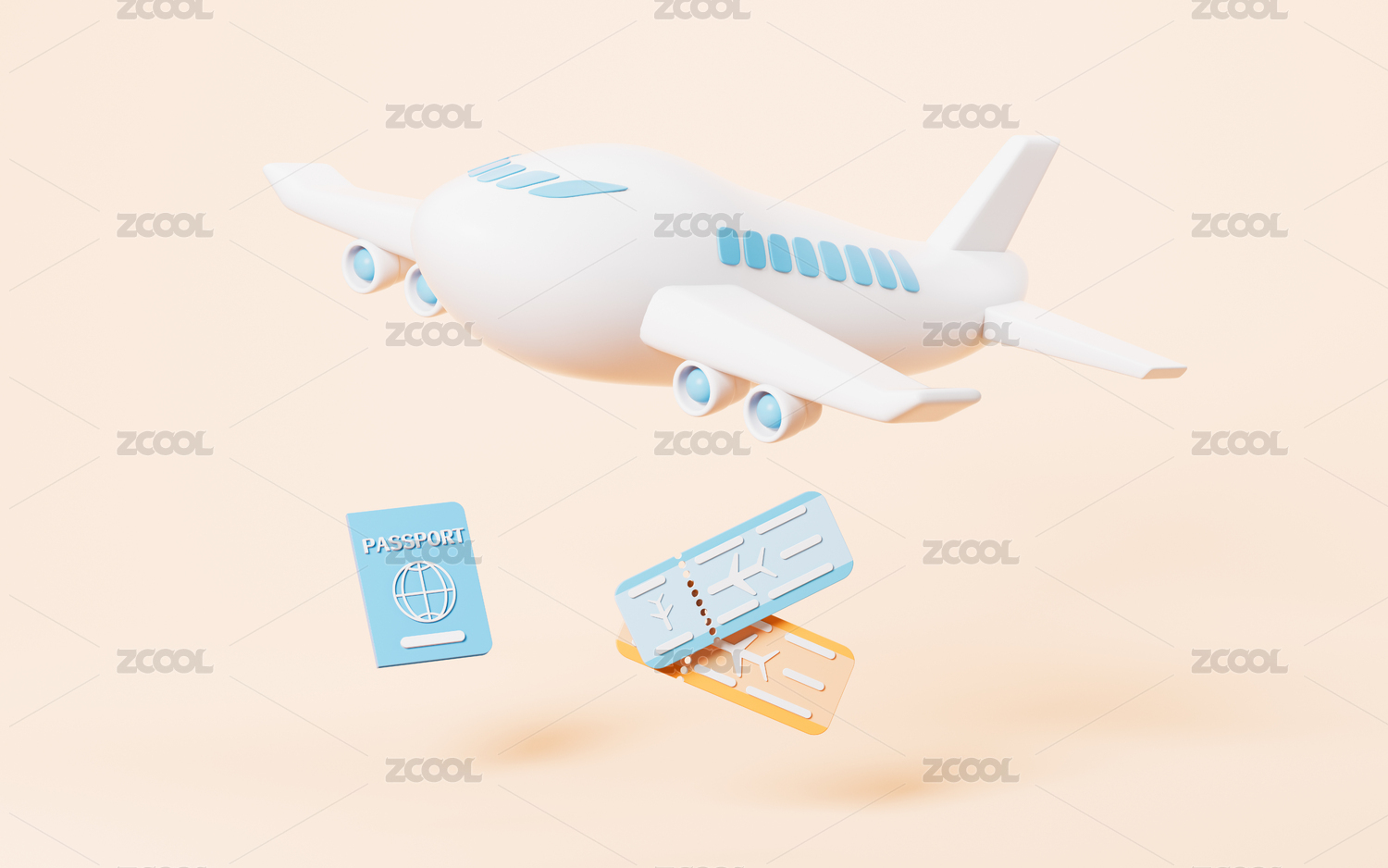 卡通机票和护照3D渲染