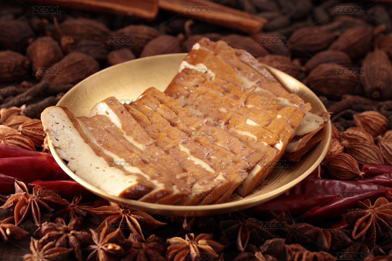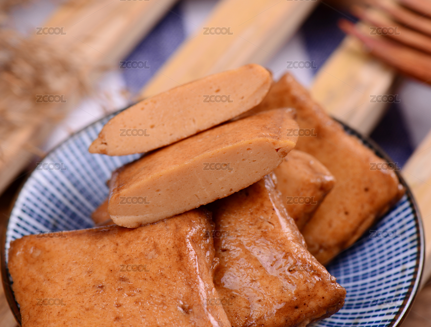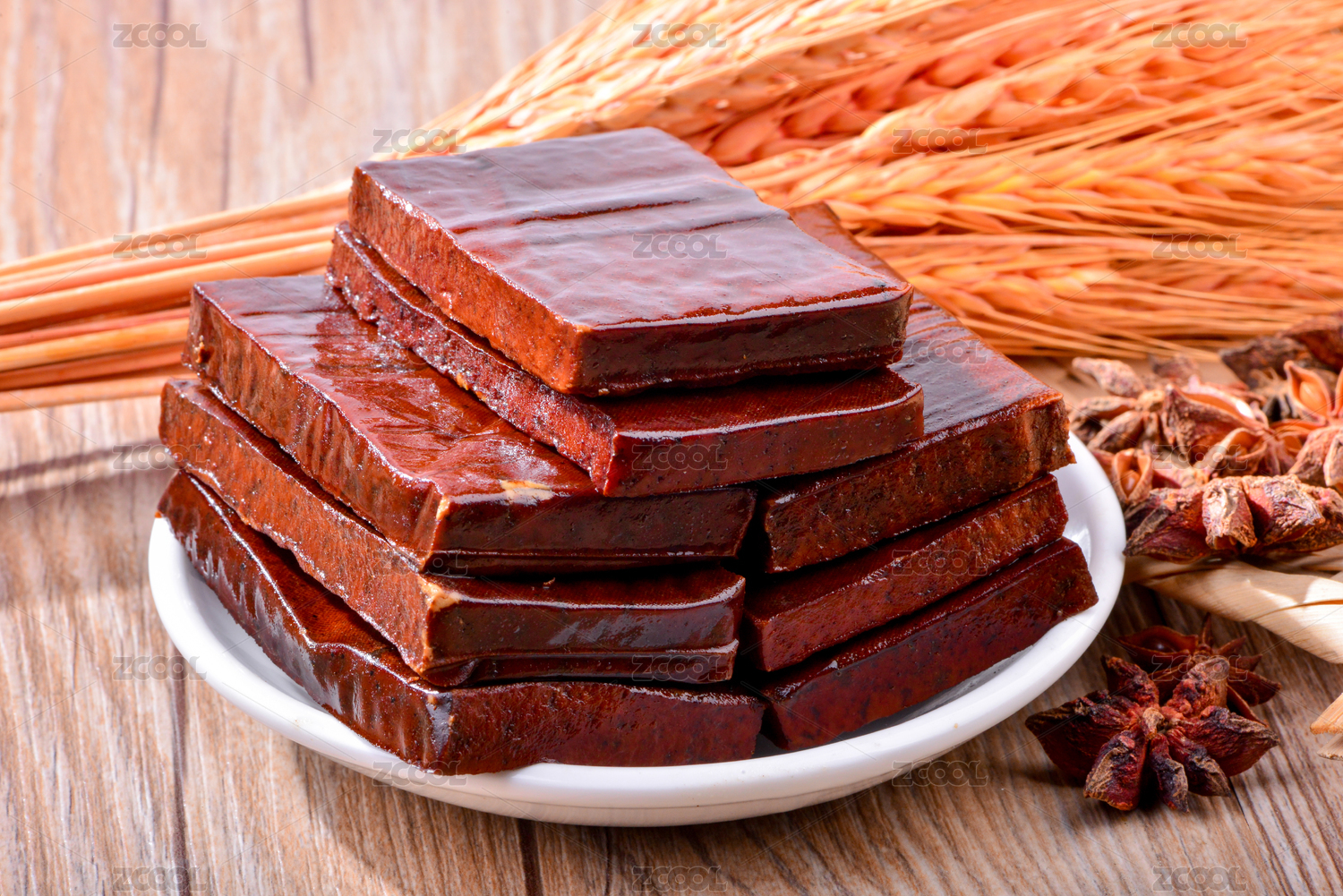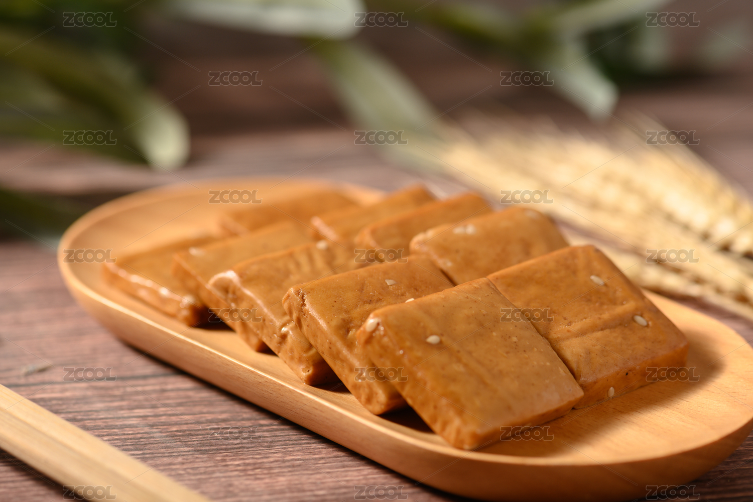 中式复古背景下放在牛皮纸上的豆干传统食品