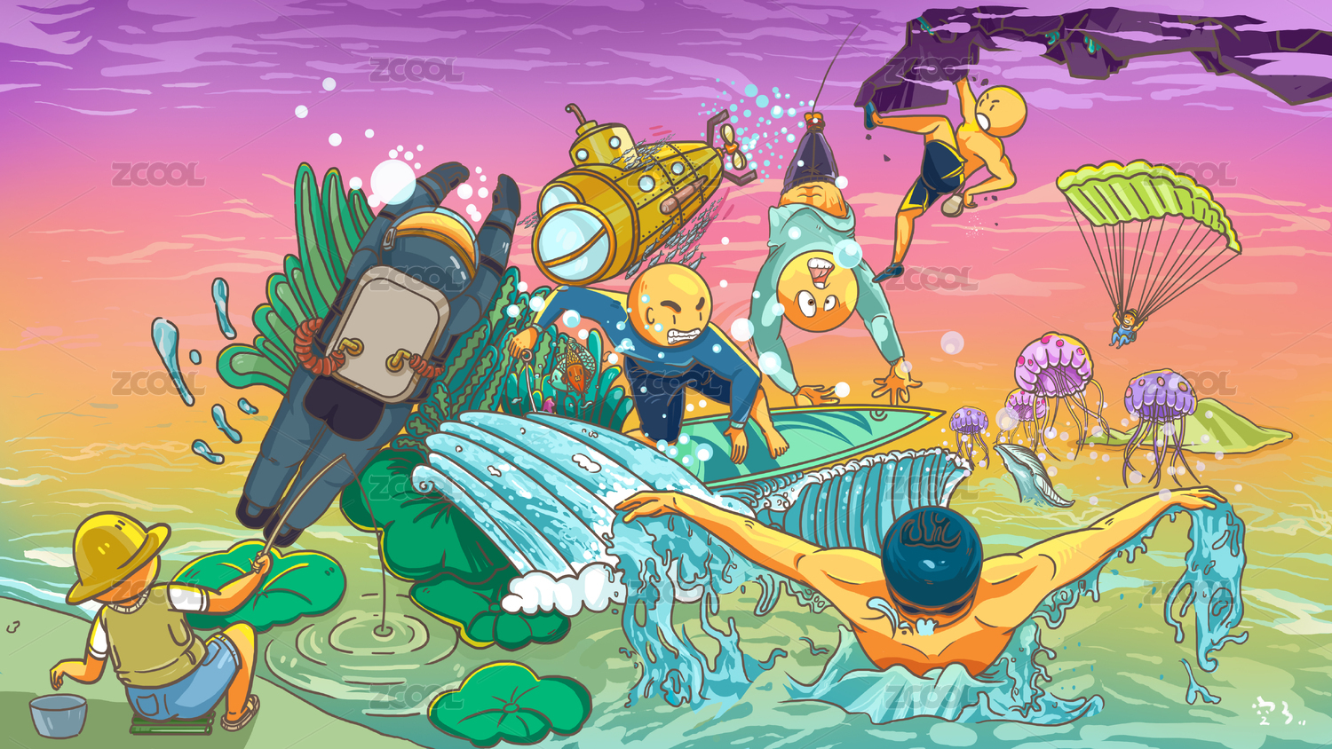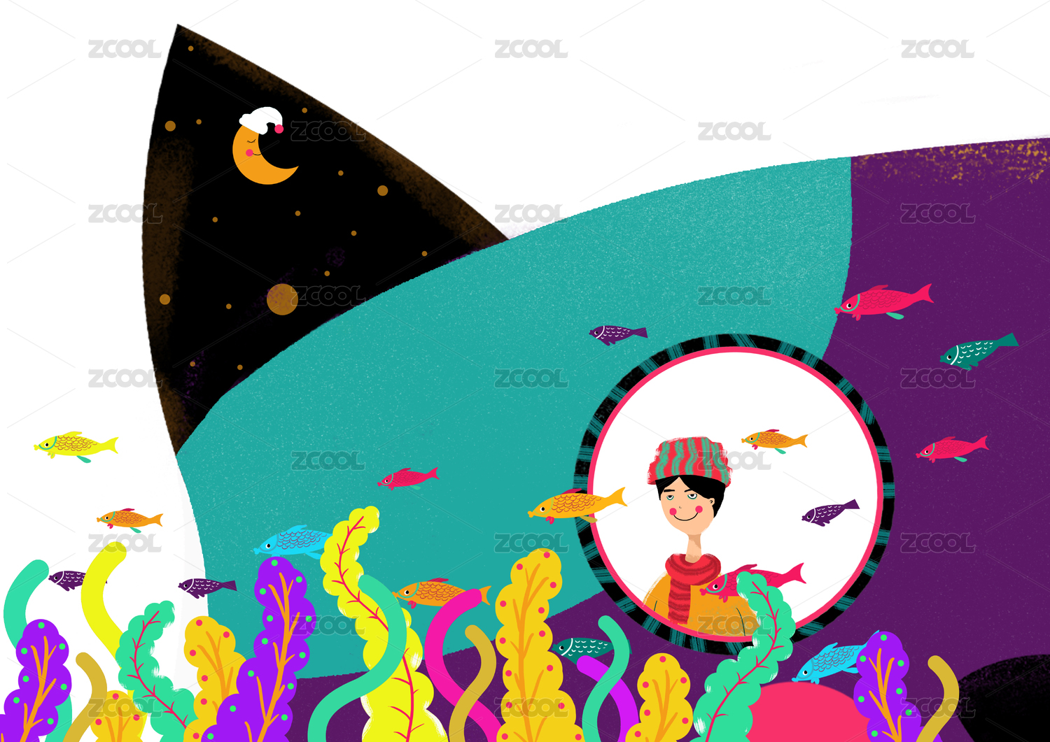 卡通风格的海底潜艇插画