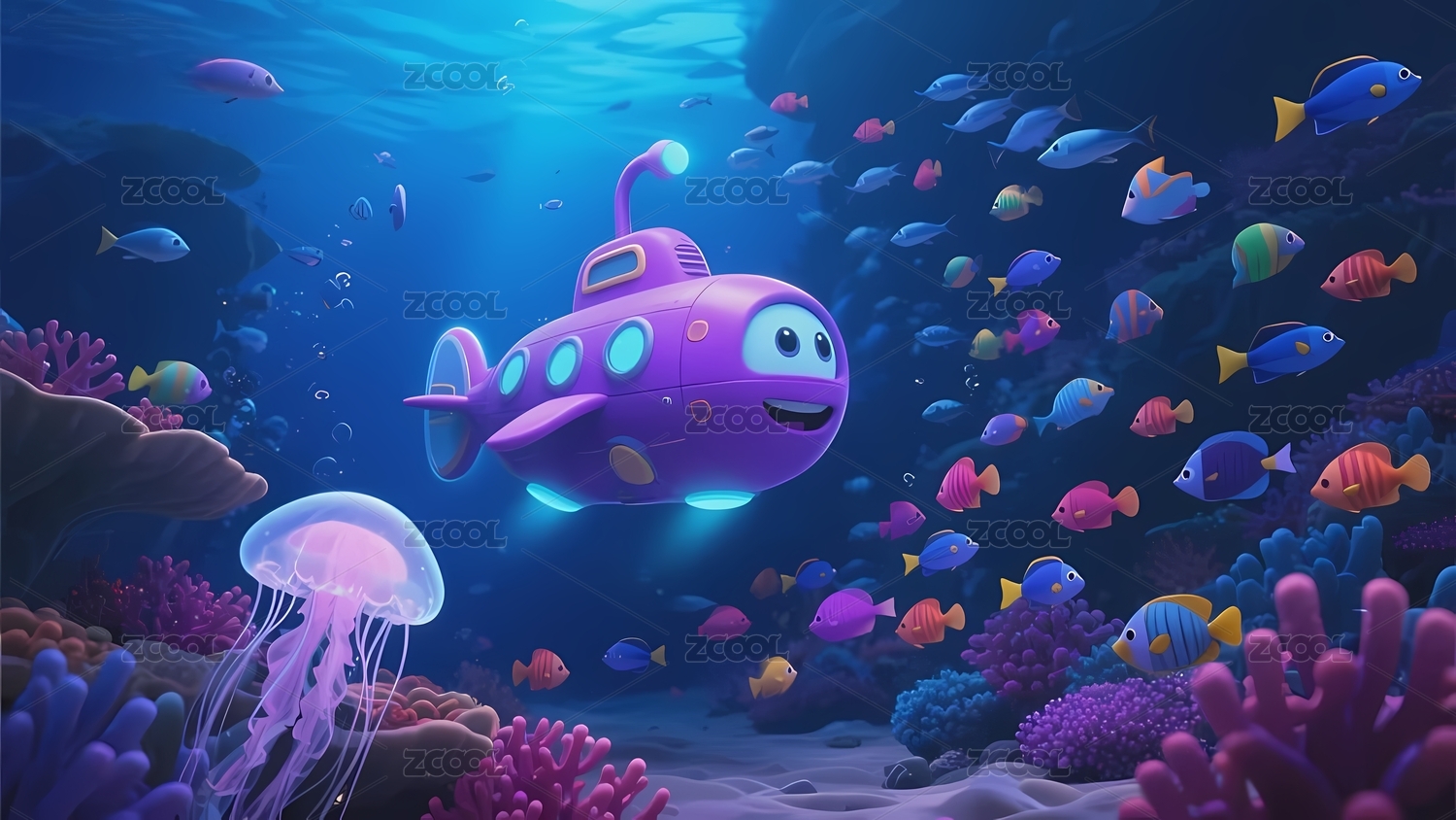 海底世界中的彩色潜艇与热带鱼