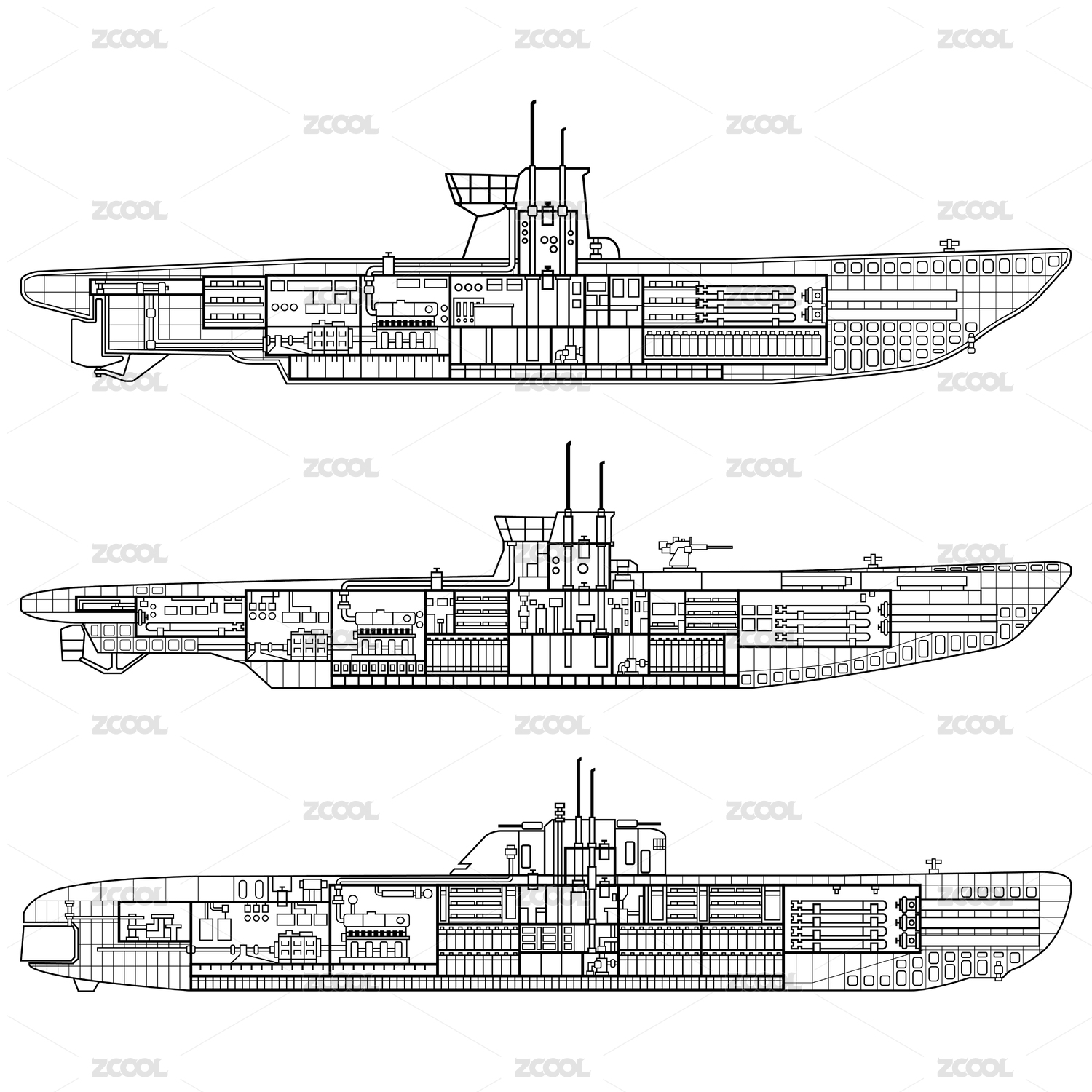 二战时期德国潜艇横截面插画素材矢量图