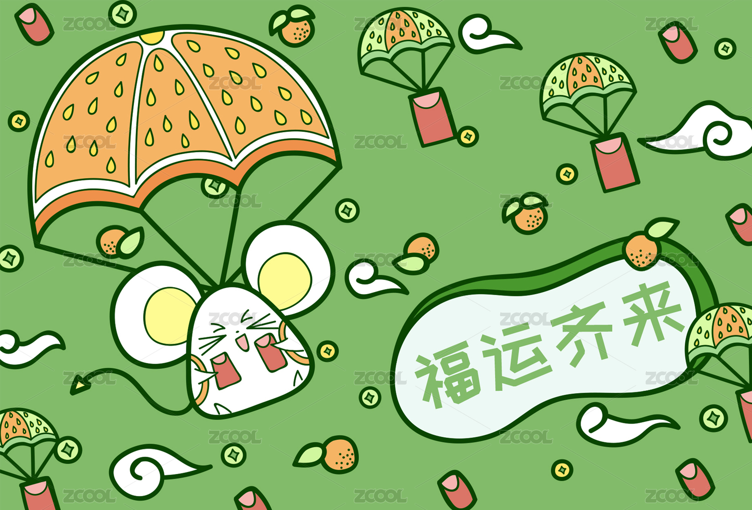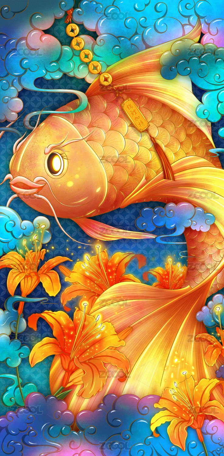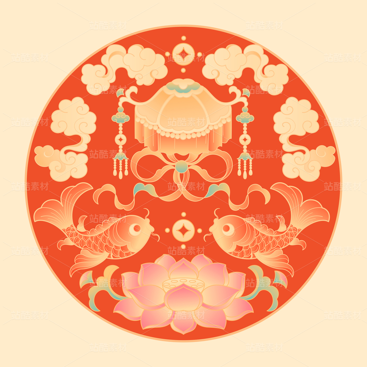 鲤鱼宝盖祥云莲花铜钱中国纹样国潮插画