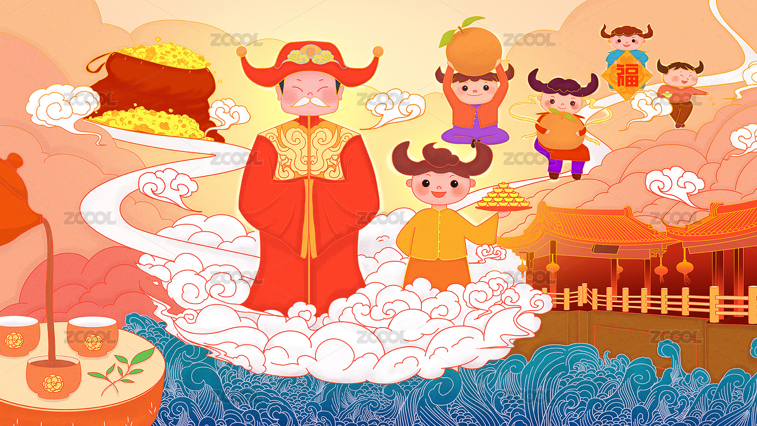 春节福娃莲花祥云灯笼铜钱烟花喜庆矢量插画
