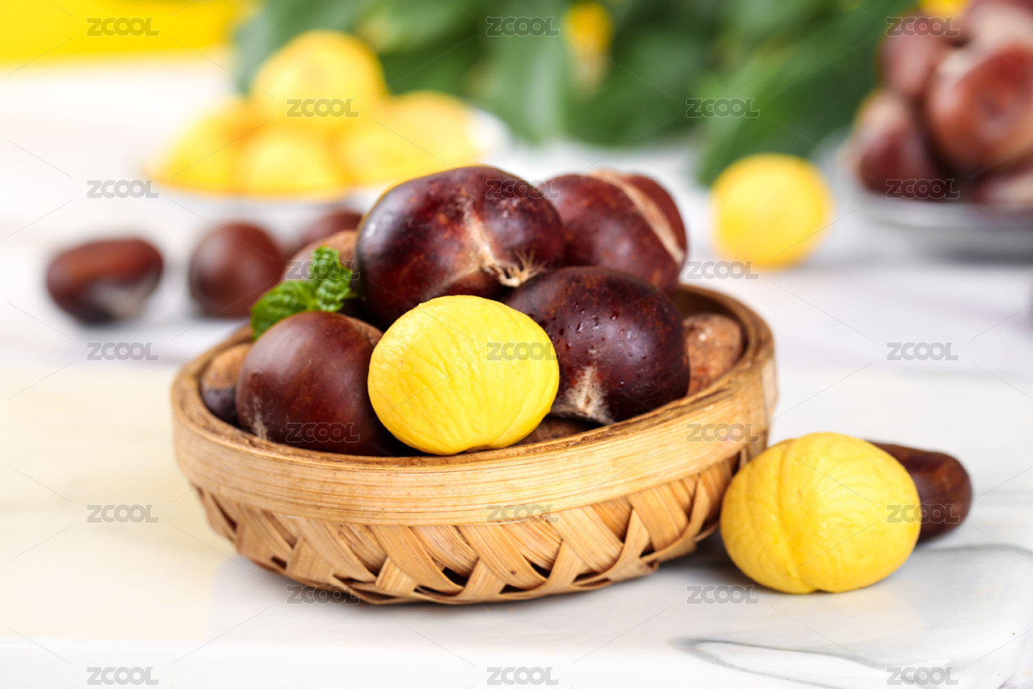 白大理石垫上放着一蓝丹东板栗和板栗仁