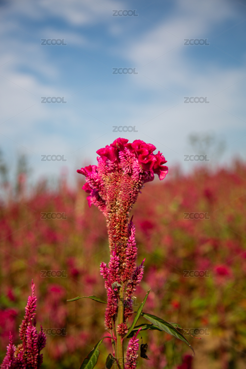 红色鸡冠花在阳光灿烂田野中蓝天下美丽绽放