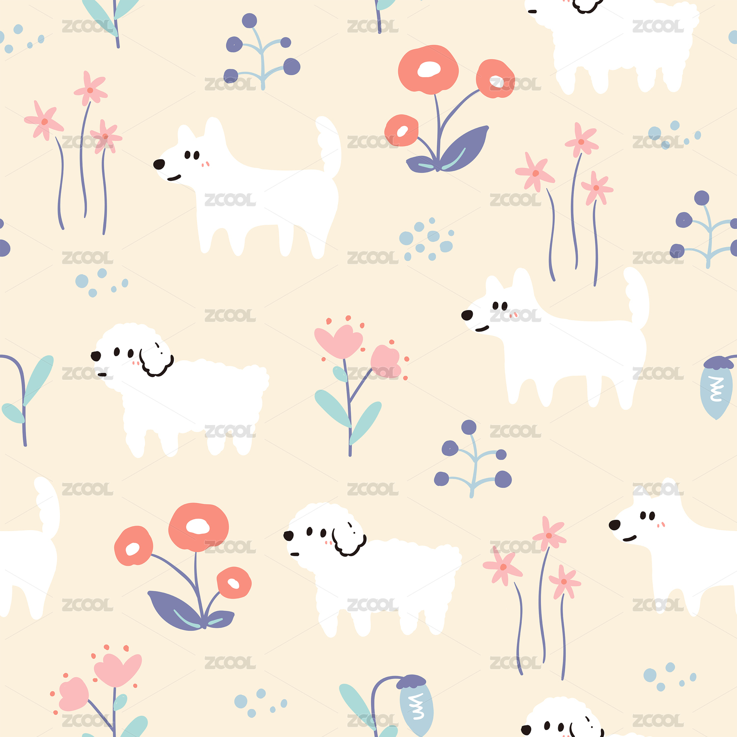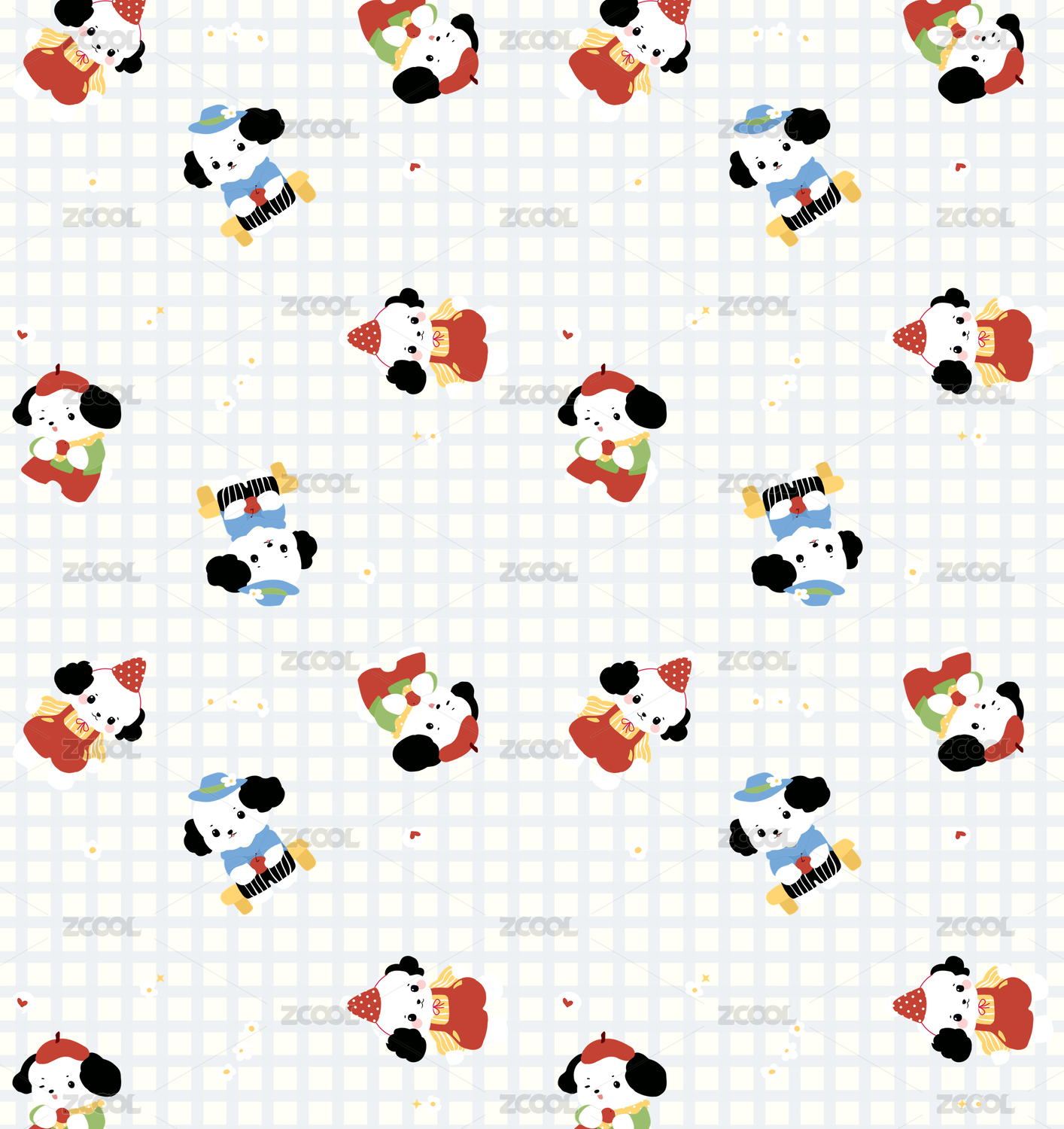 可爱卡通宠物小狗四方连续图案